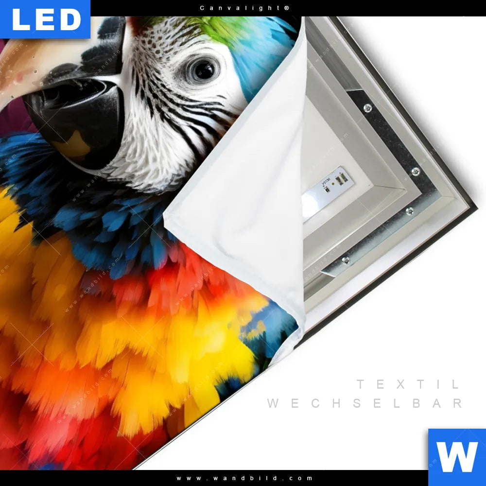 Canvalight® TEX Leuchtbild | Papagei mit bunten Farbspritzern | Hochformat