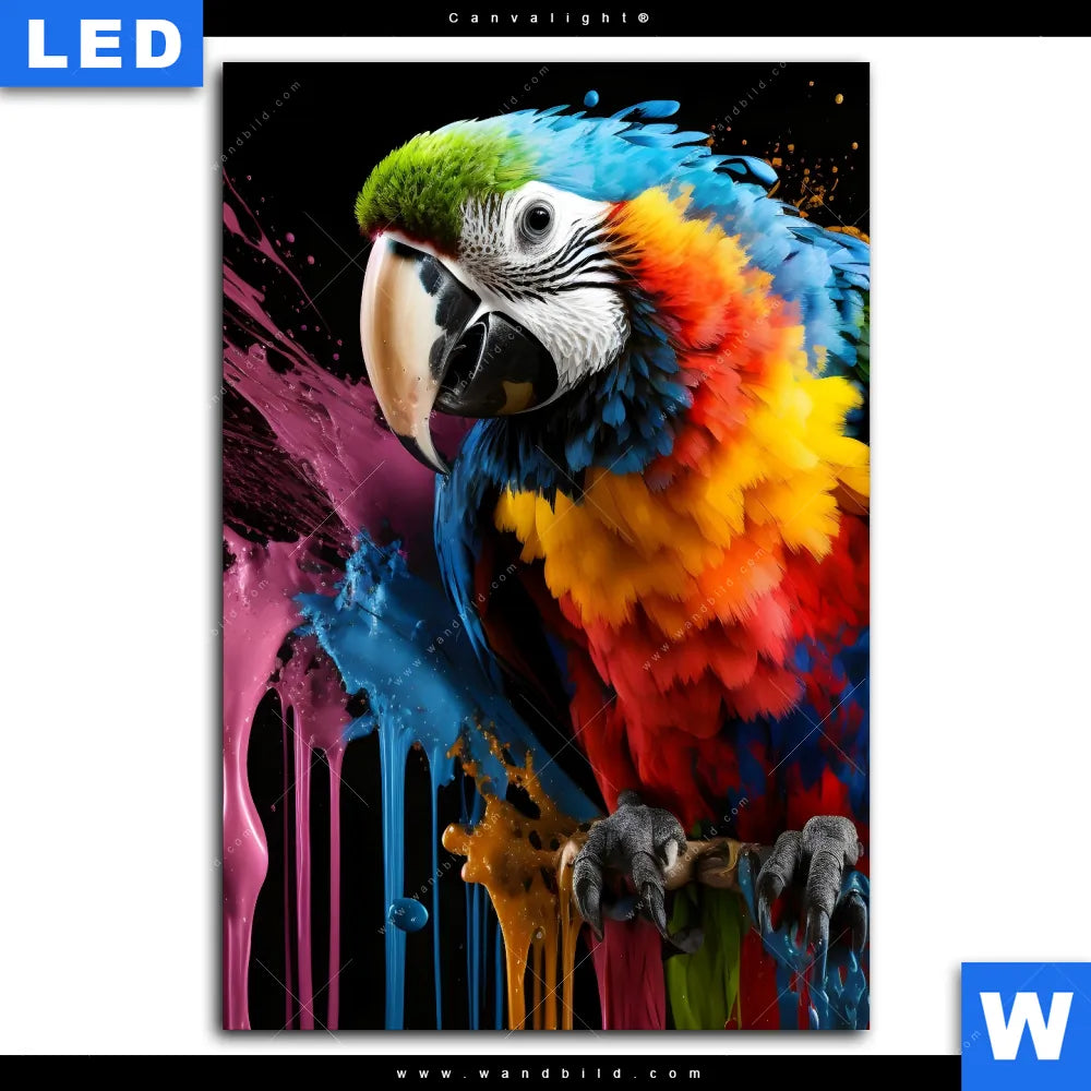 Canvalight® Leuchtbild | Papagei mit bunten Farbspritzern | Hochformat