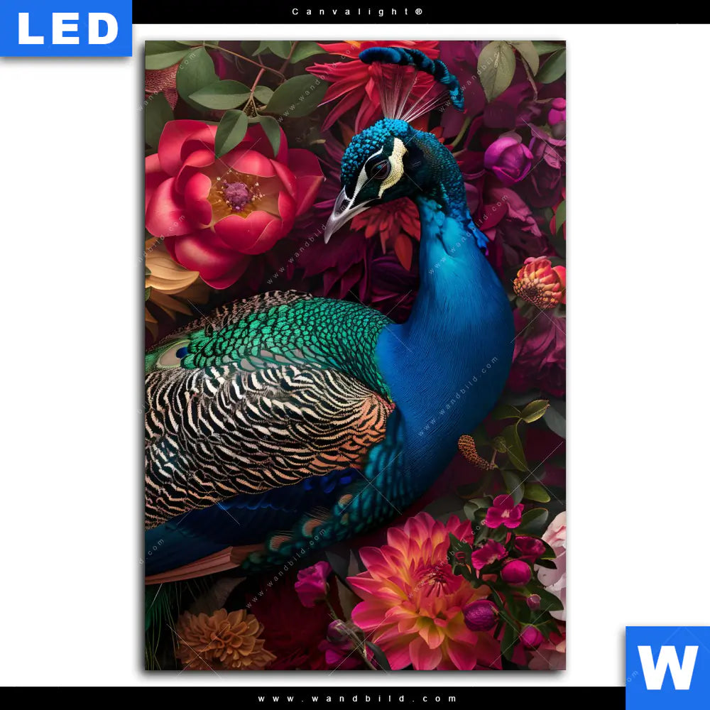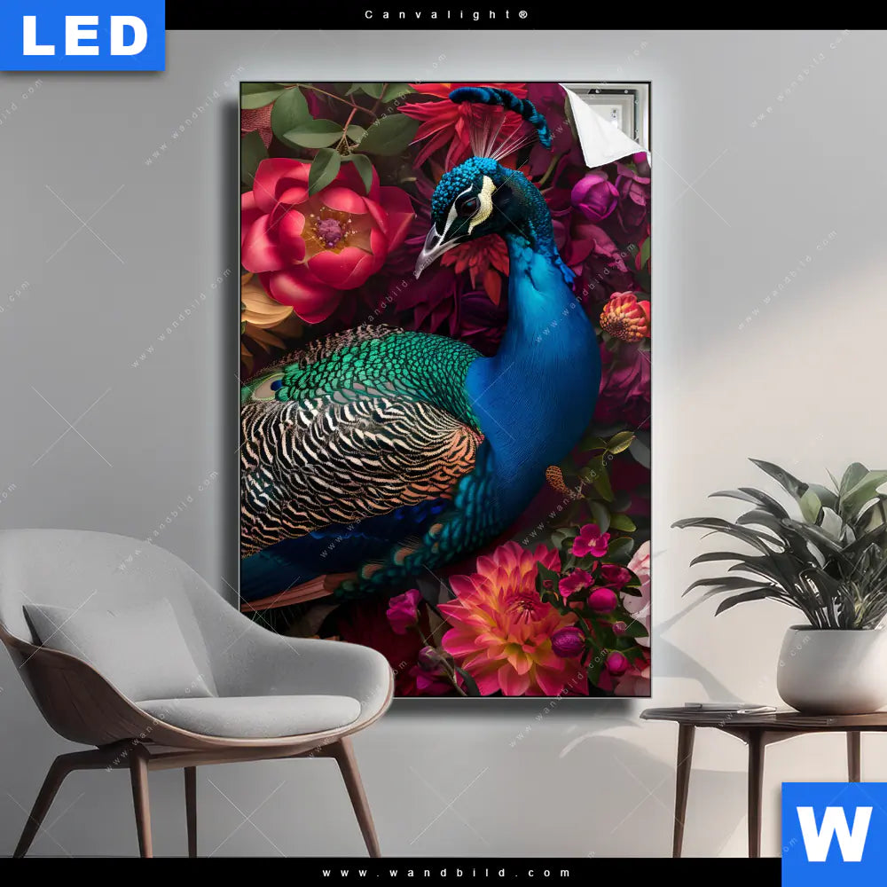 Canvalight® Leuchtbild | Prachtvoller Pfau und Blüten | Hochformat