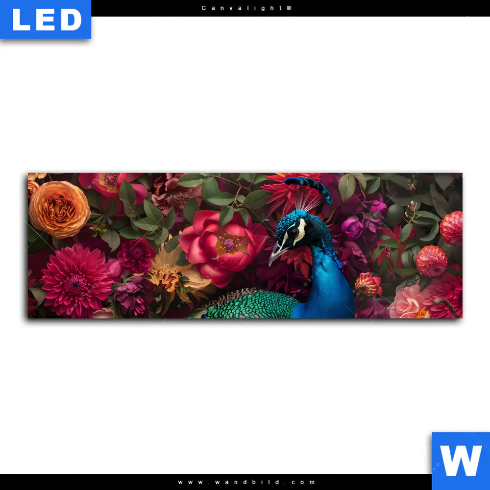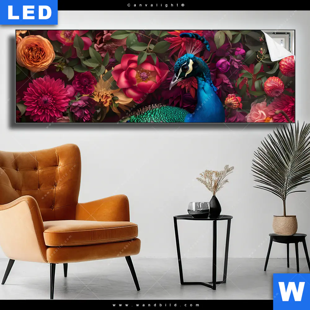 Canvalight® Leuchtbild | Prachtvoller Pfau und Blüten | Panorama