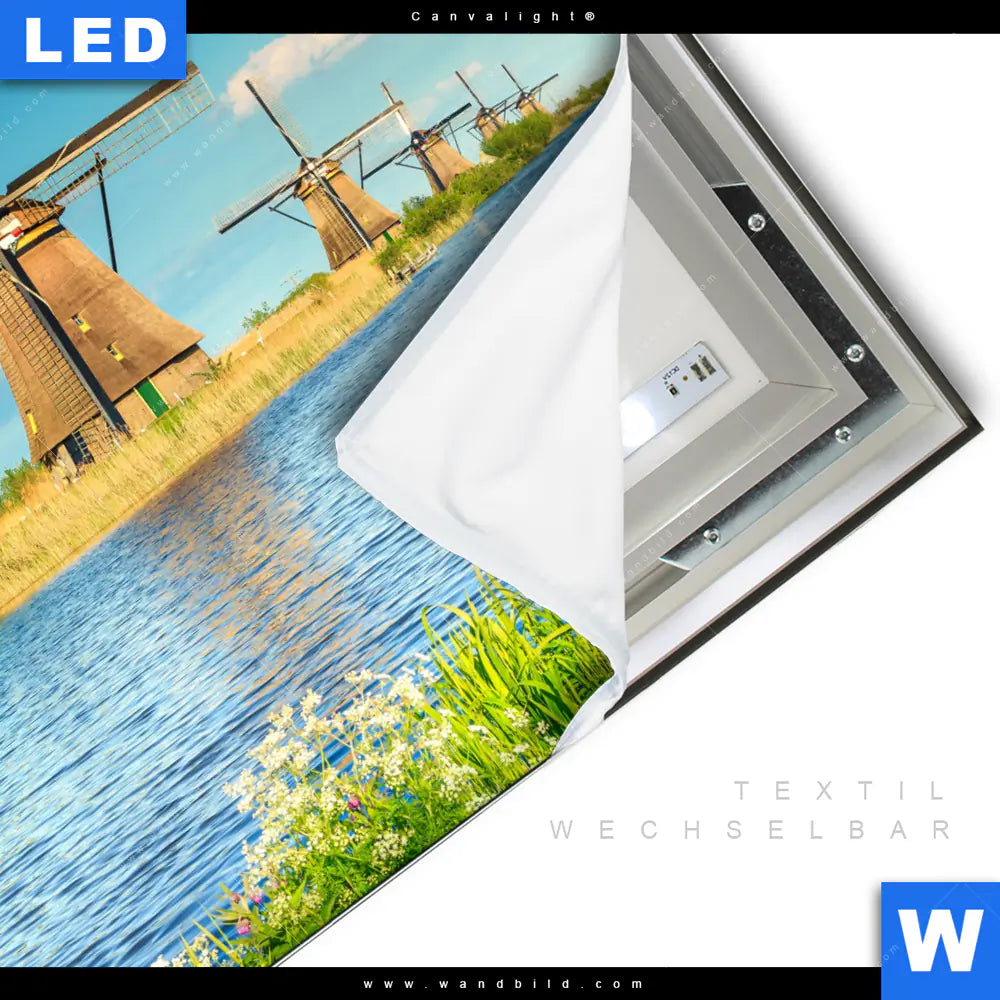 Canvalight® TEX Leuchtbild | Romantik zwischen Windmühlen | Quadrat