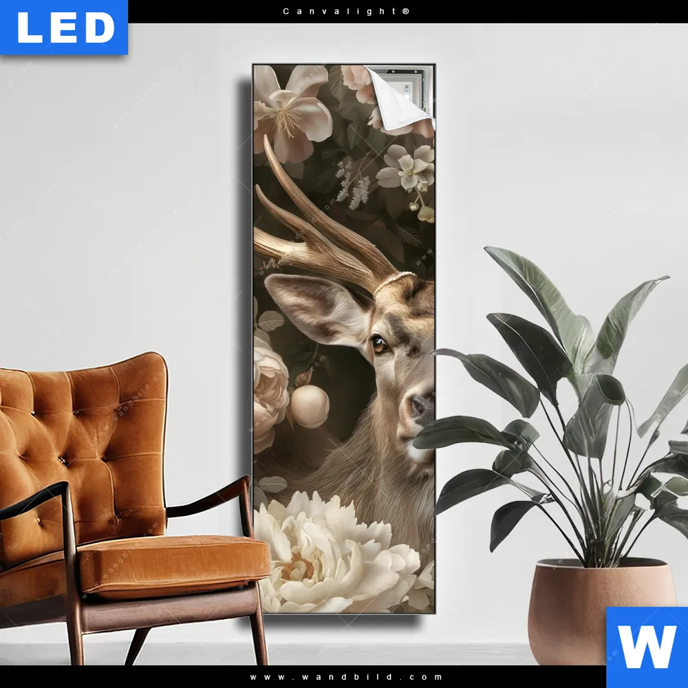Canvalight® TEX Leuchtbild | Romantischer Hirsch mit Blumen | Schmal