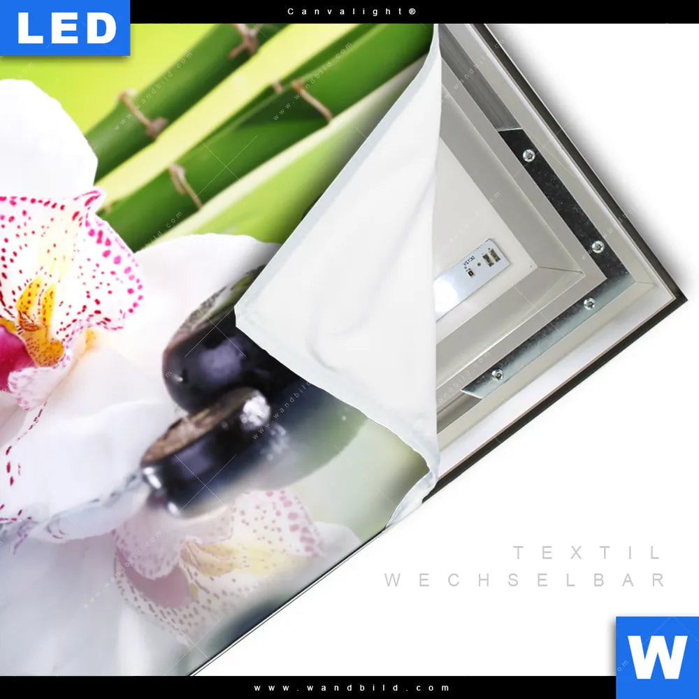 LED-Textilrahmen-Bild mit austauschbarem Blumen - Botanik, Buddha - Feng Shui Textil-Druck (Wechselbild)