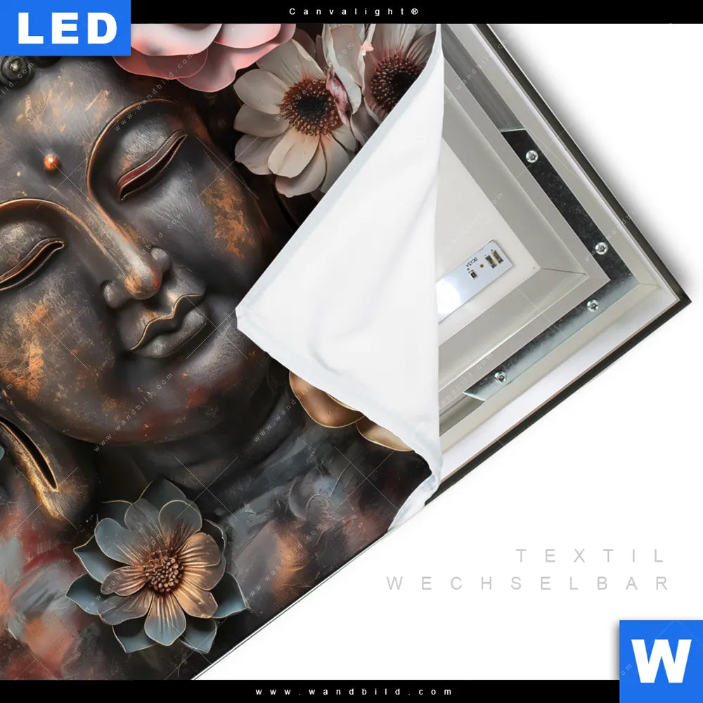 LED-Textilrahmen-Bild mit austauschbarem Buddha - Feng Shui, Blumen - Botanik Textil-Druck (Wechselbild)