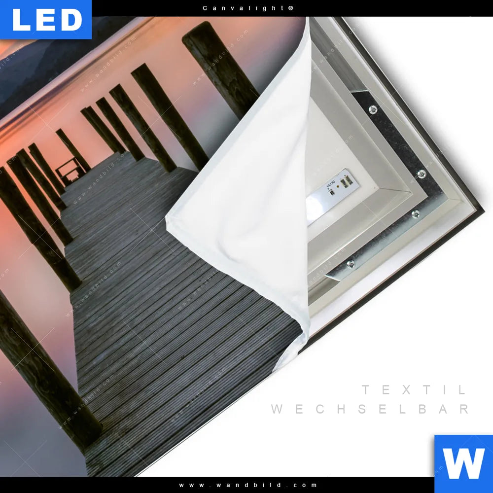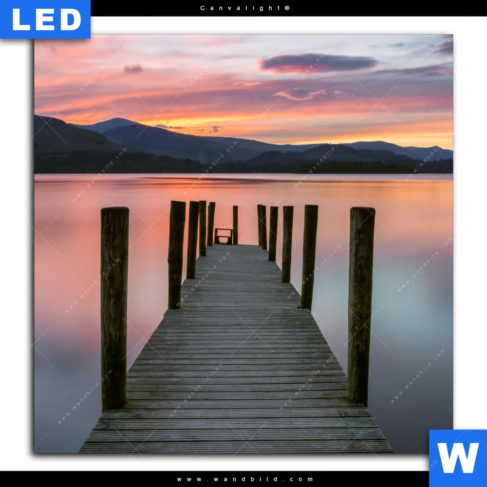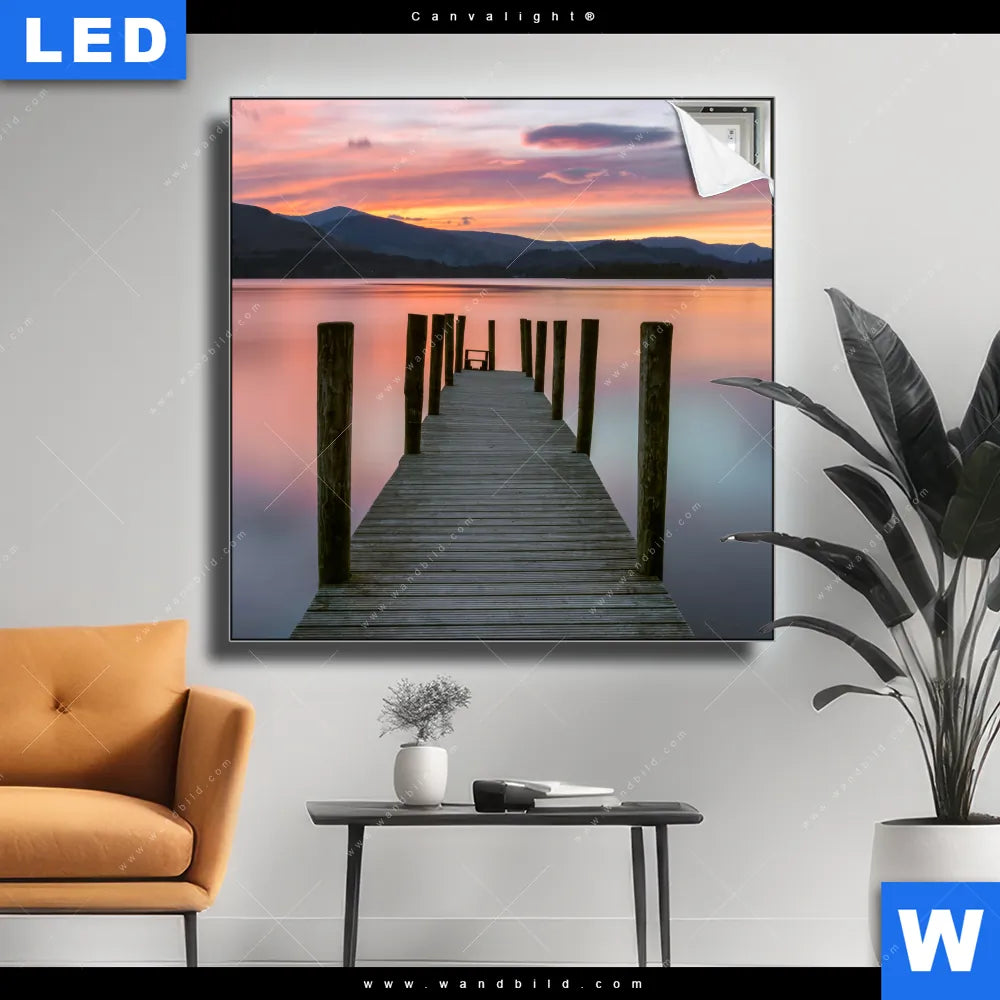 Canvalight® TEX Leuchtbild | Steg in den Sonnenuntergang | Quadrat
