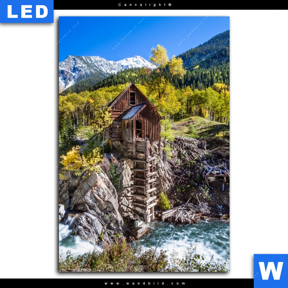 Canvalight® Leuchtbild | Waldhütte am Fluss | Hochformat
