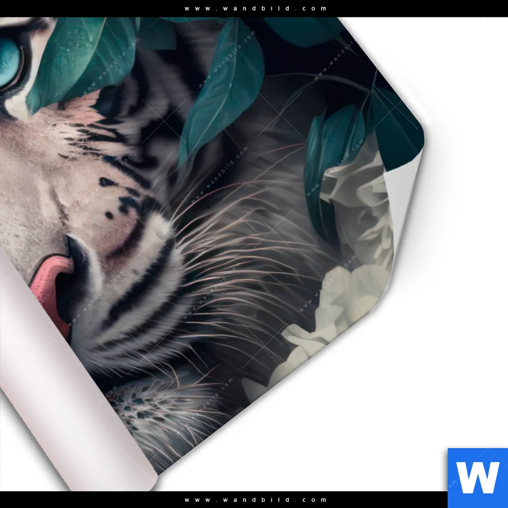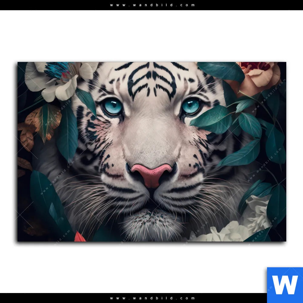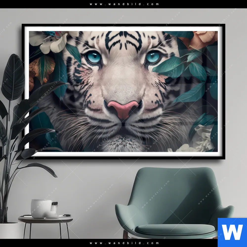 Poster | Weißer Tiger mit blauen Augen zwischen Blumen | Querformat