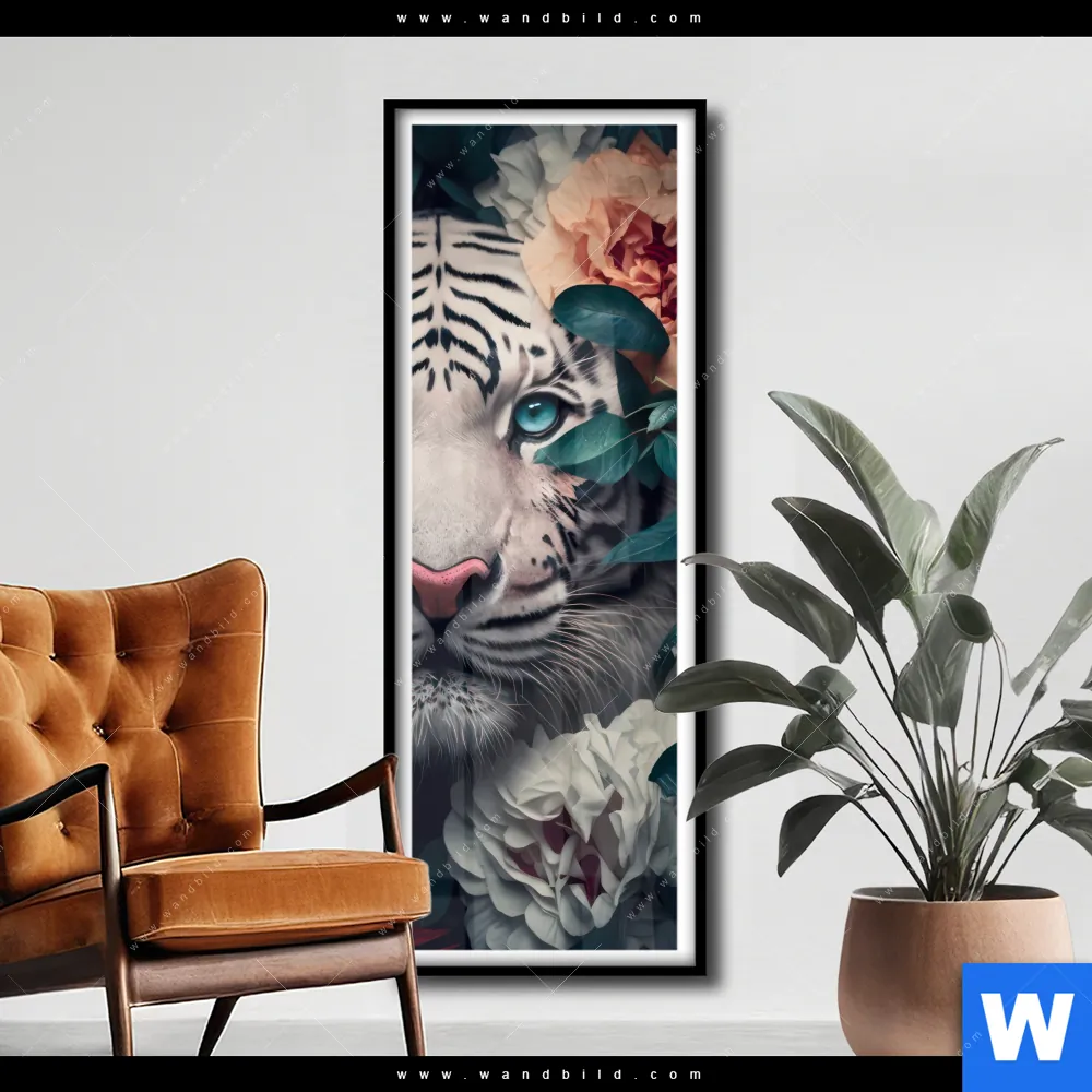 Poster | Weißer Tiger mit blauen Augen zwischen Blumen | Schmal