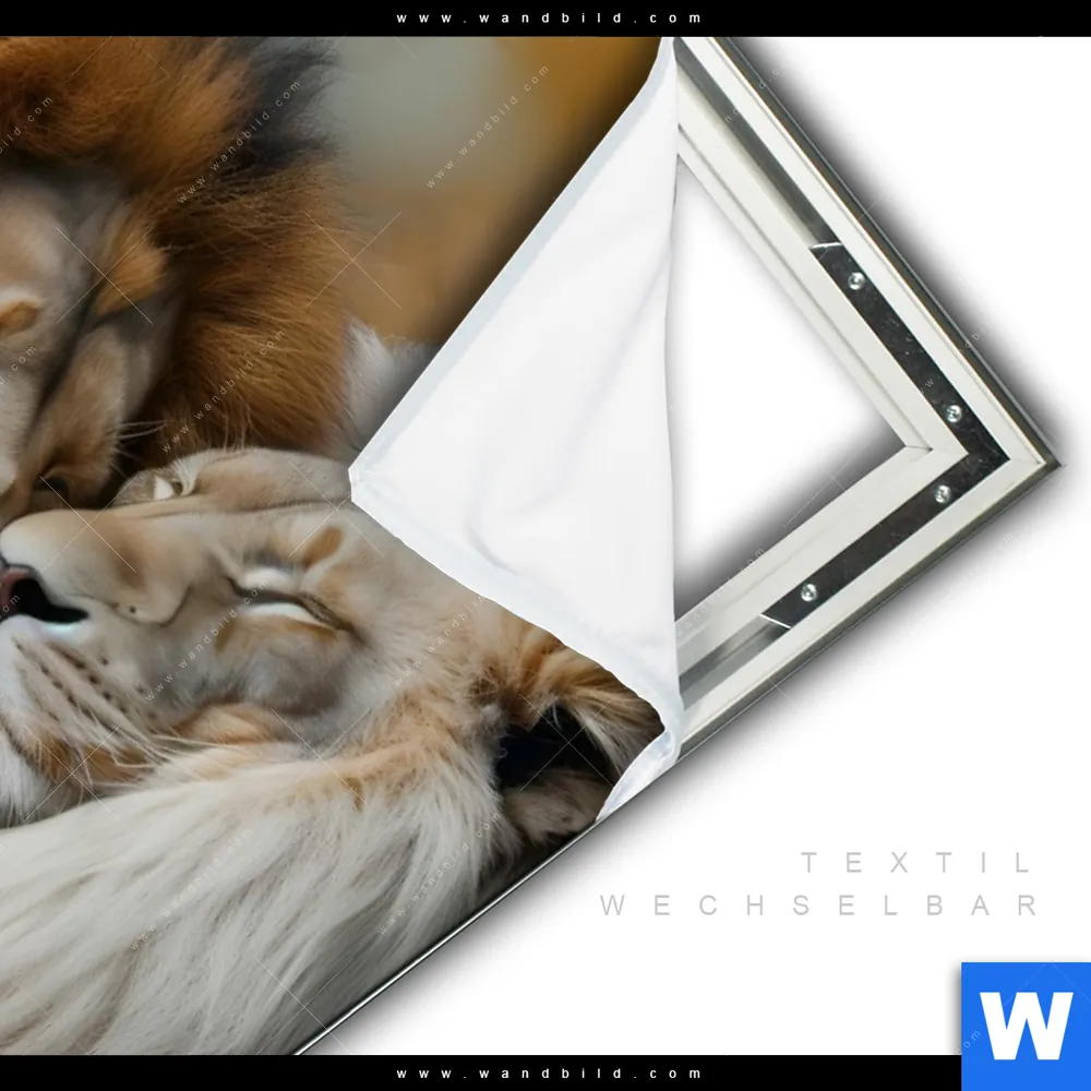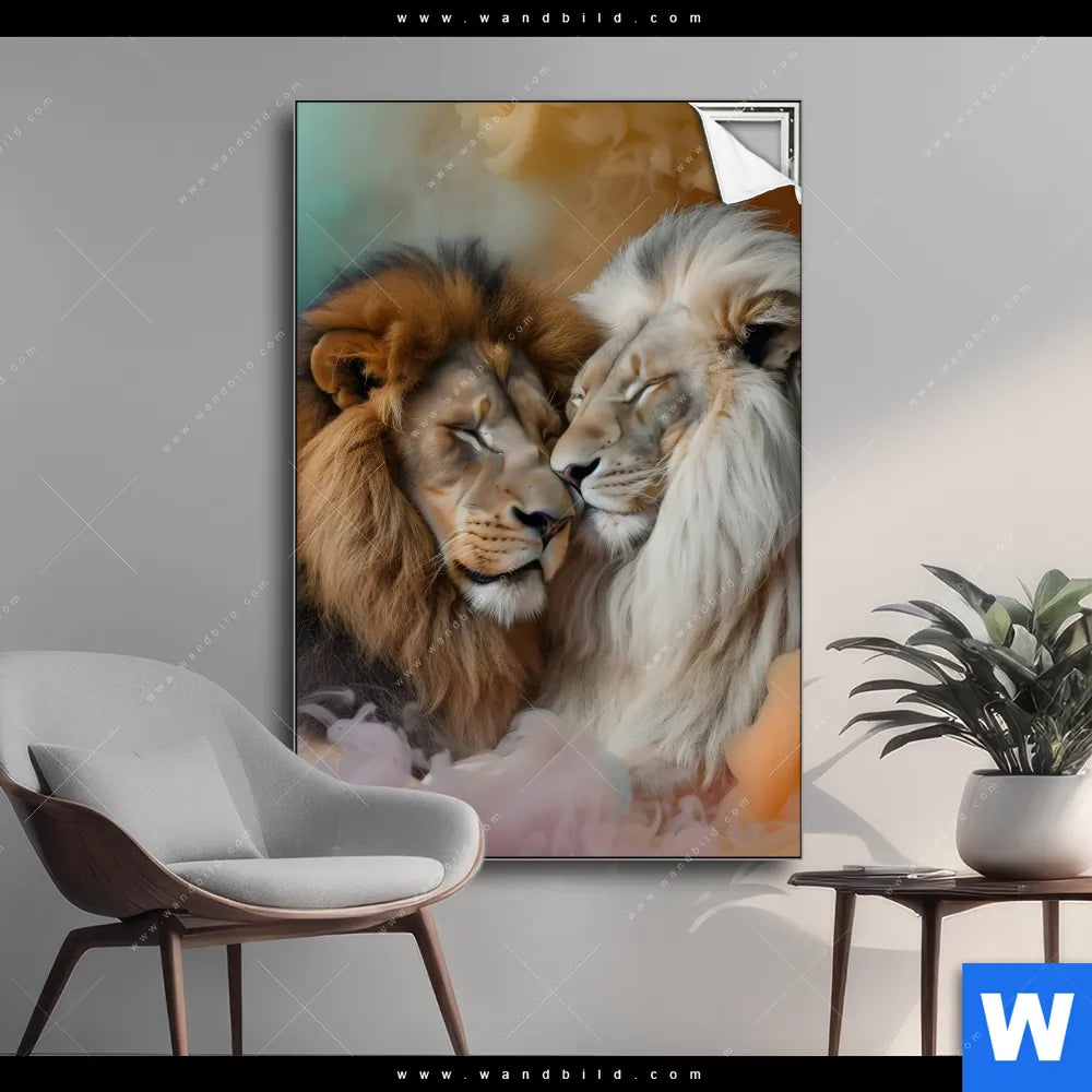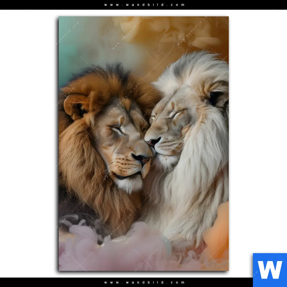 Spannbild | Sanfte Löwenmomente in buntem Nebel | Hochformat