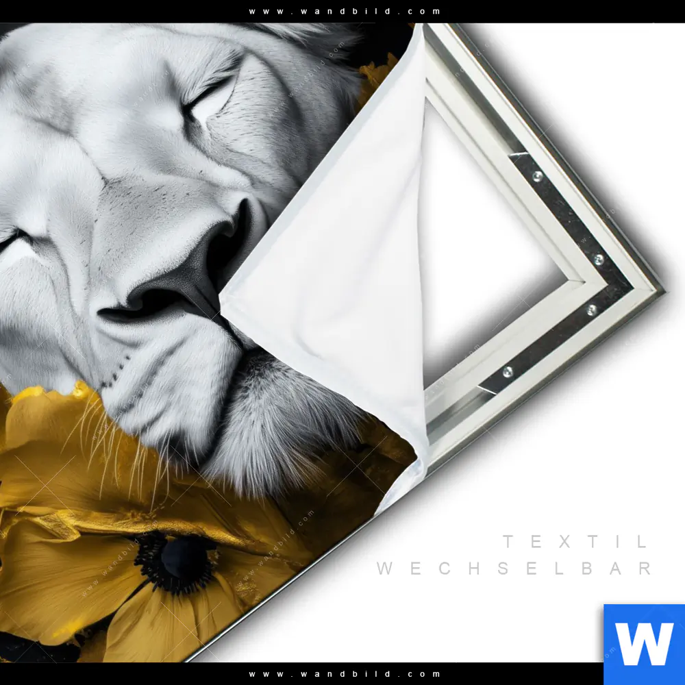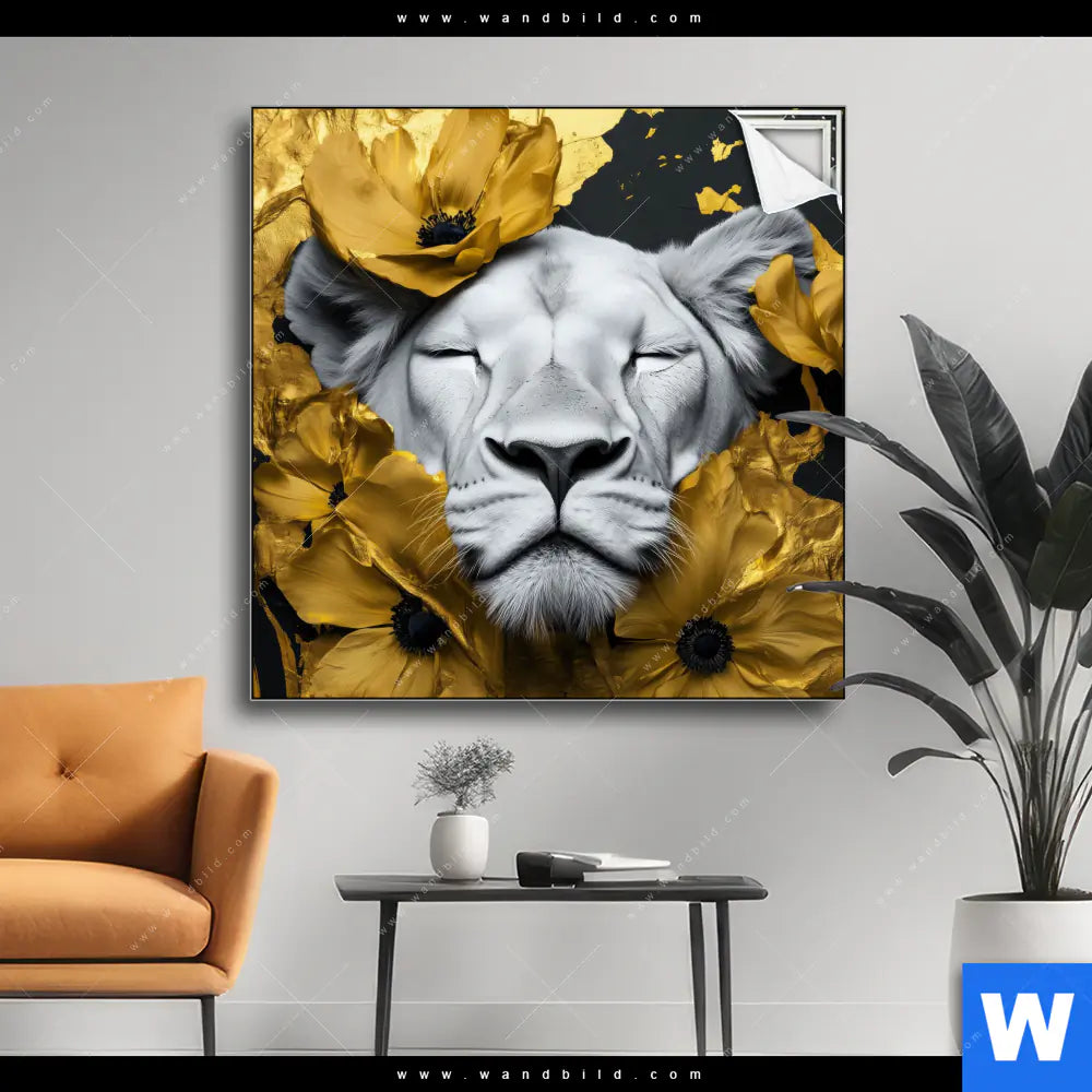 Spannbild | Weiße Löwin mit Goldblüten | Quadrat