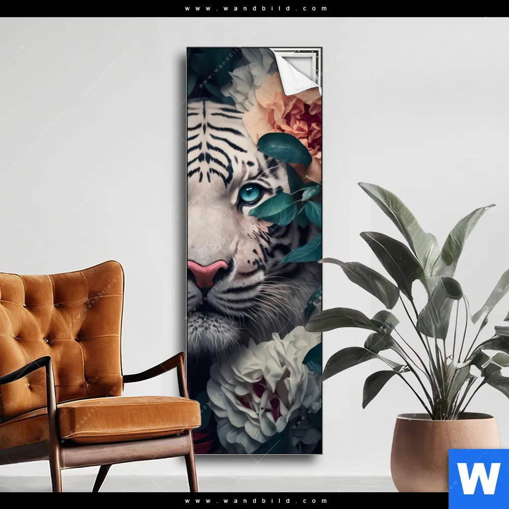 Spannbild | Weißer Tiger mit blauen Augen zwischen Blumen | Schmal