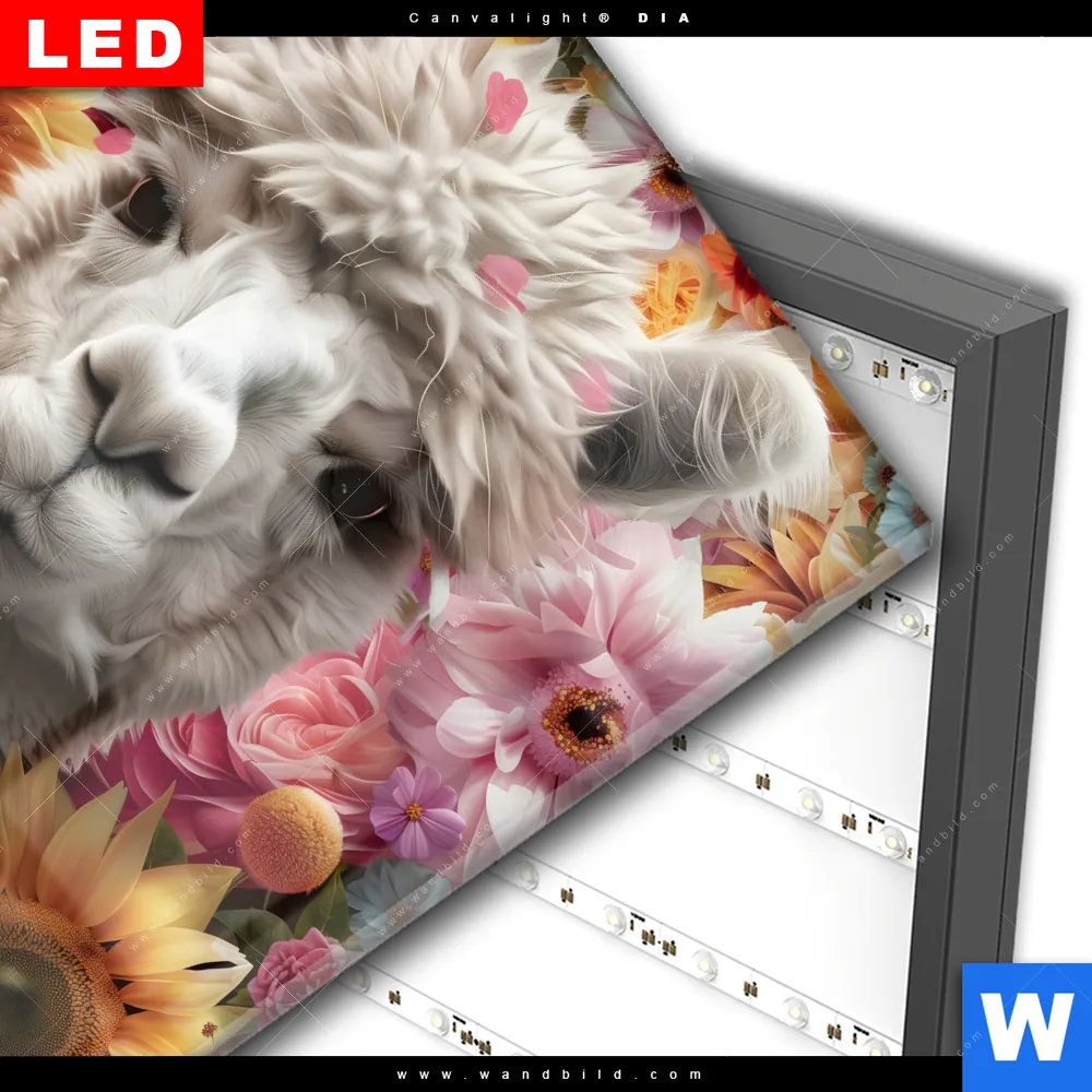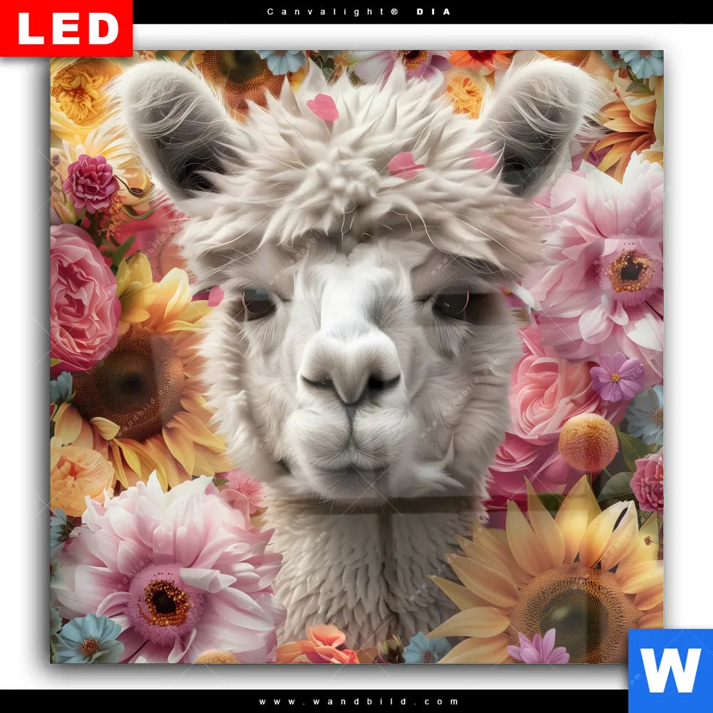 Wechselmotiv Acrylglas Canvalight® DIA | Alpaka mit Blumen | Quadrat