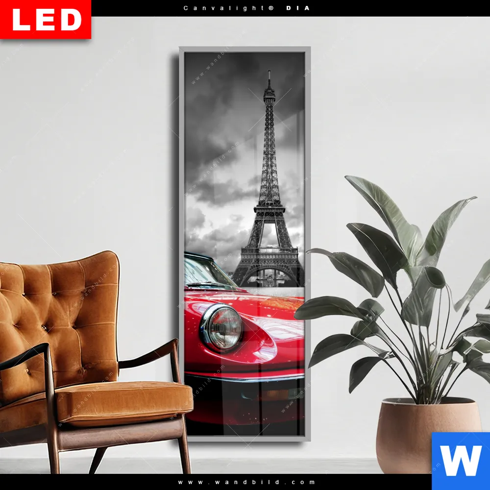 Wechselmotiv Acrylglas Canvalight® DIA | Eiffelturm & Rotes Auto | Schmal