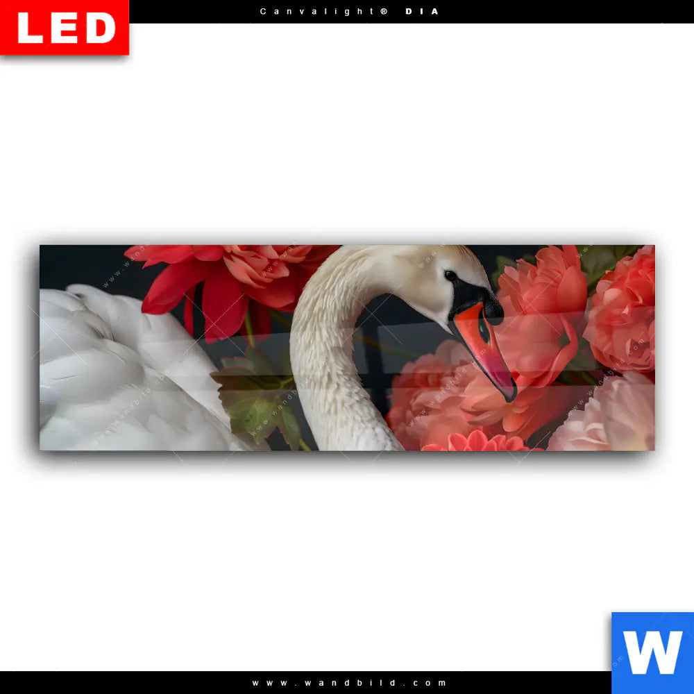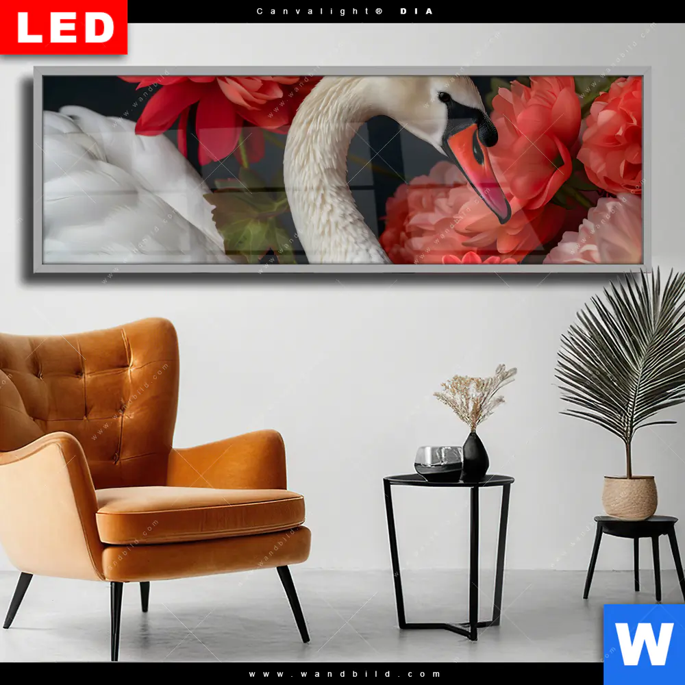 Wechselmotiv Acrylglas Canvalight® DIA | Eleganter Schwan mit Blumen | Panorama
