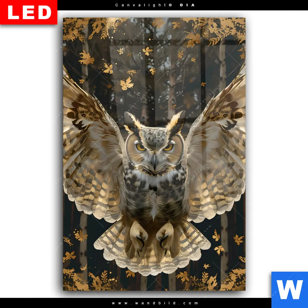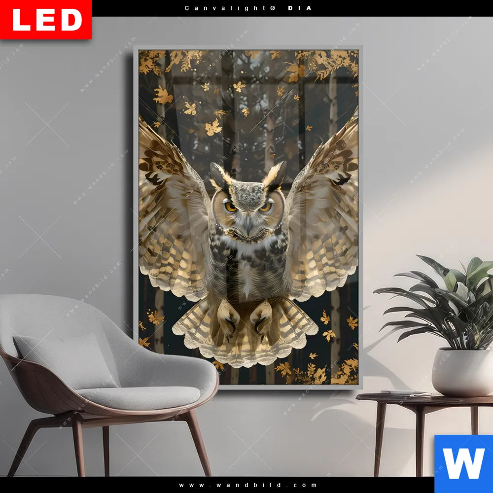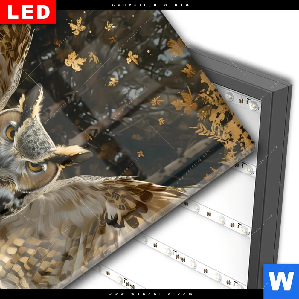 Wechselmotiv Acrylglas Canvalight® DIA | Eule inmitten goldener Blätter | Hochformat