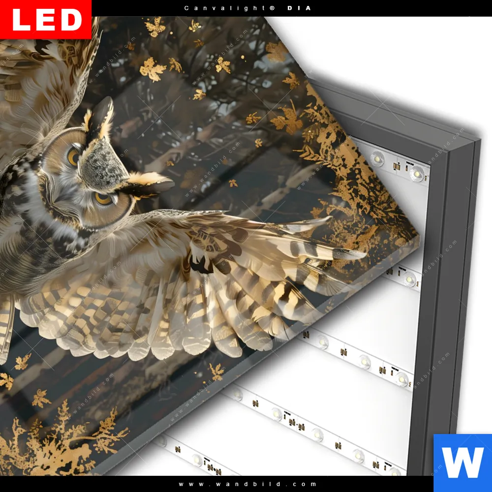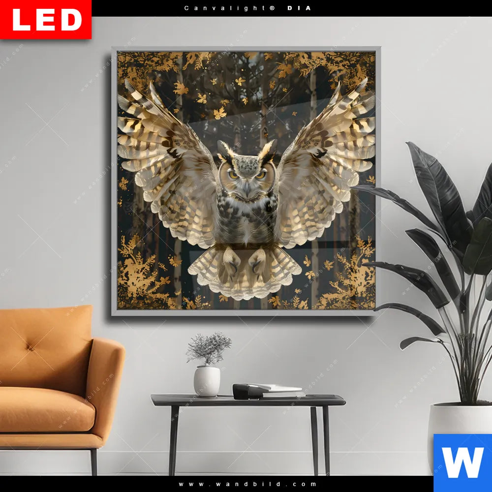 Wechselmotiv Acrylglas Canvalight® DIA | Eule inmitten goldener Blätter | Quadrat