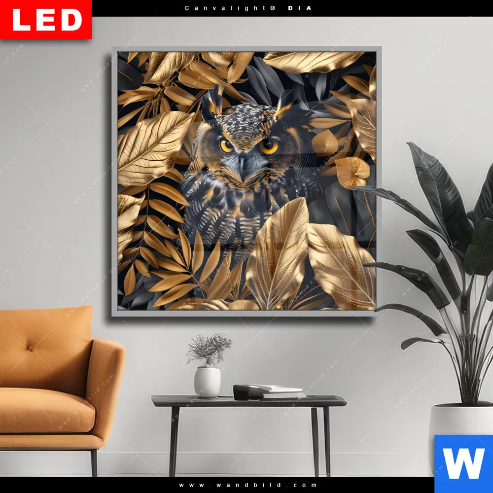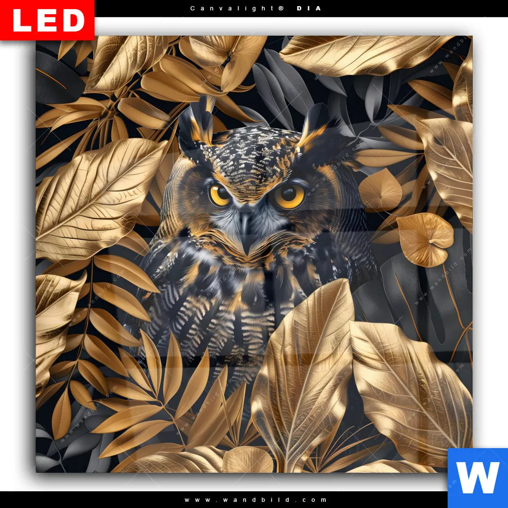 Wechselmotiv Acrylglas Canvalight® DIA | Eule und goldene Blätter | Quadrat