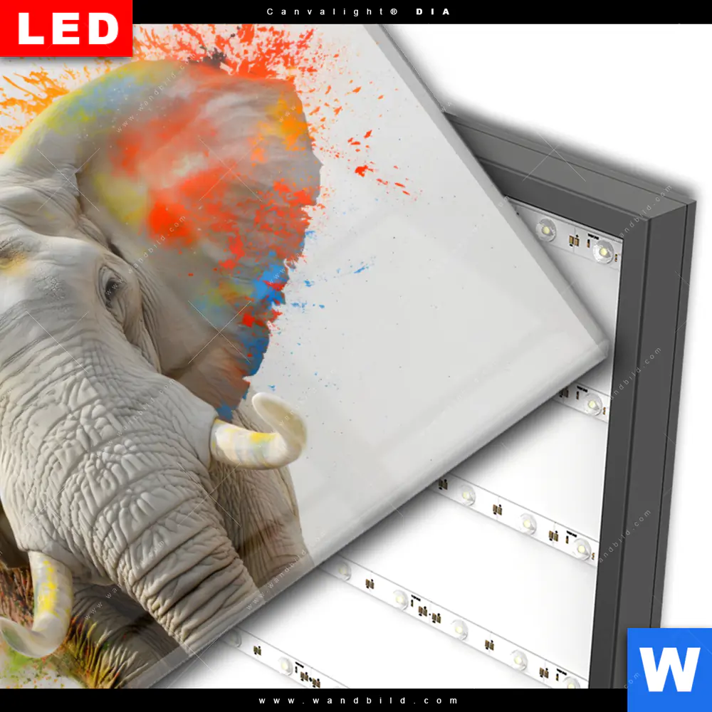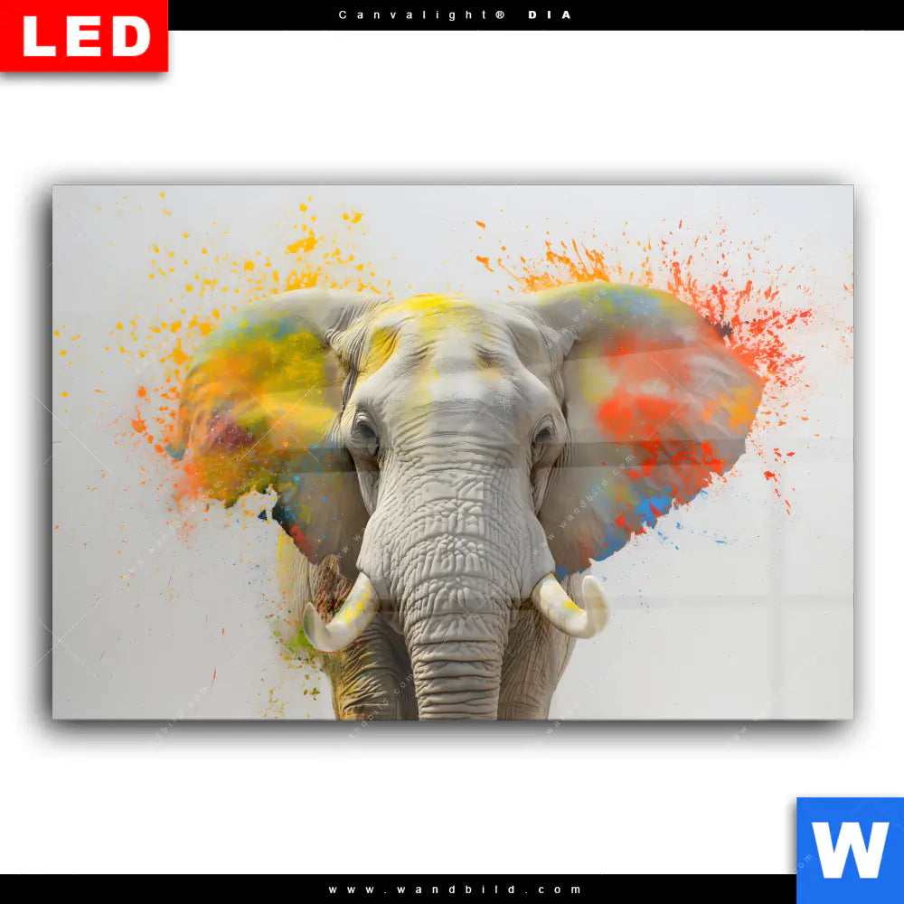 Wechselmotiv Acrylglas Canvalight® DIA | Farbenexplosion mit Elefant | Querformat