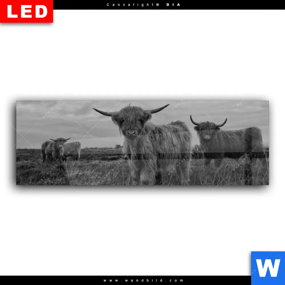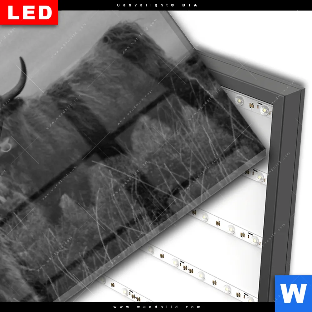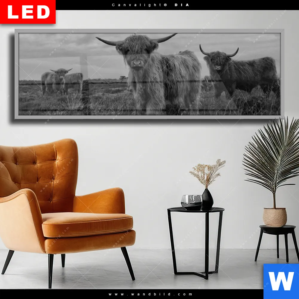Wechselmotiv Acrylglas Canvalight® DIA | Hochland-Rind Schwarz-Weiß | Panorama