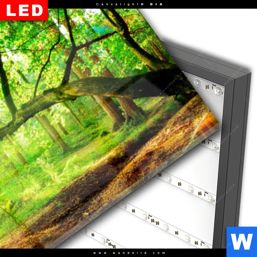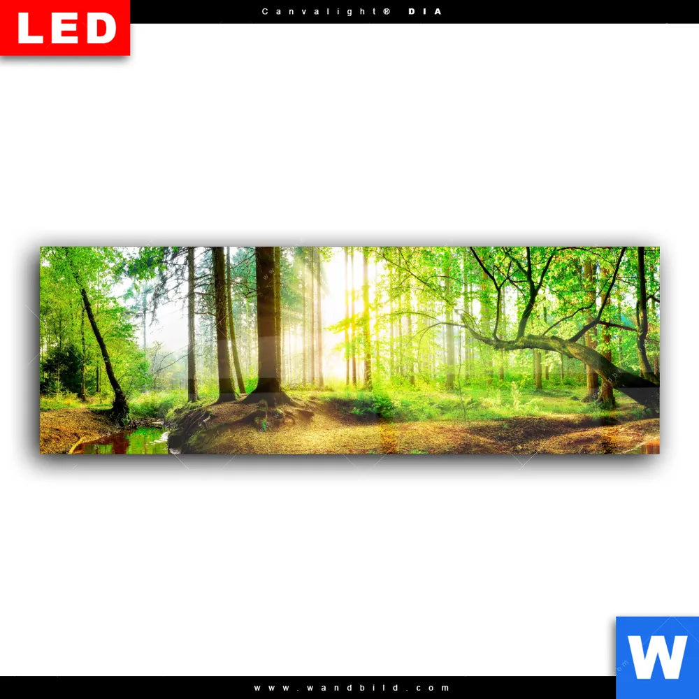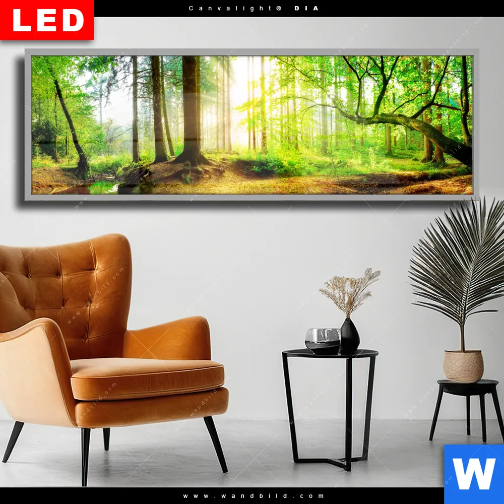Wechselmotiv Acrylglas Canvalight® DIA | Idyllischer Wald bei Sonnenaufgang | Panorama