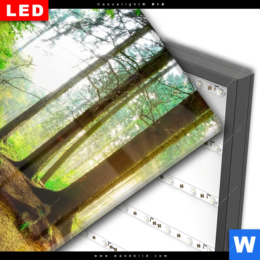 Wechselmotiv Acrylglas Canvalight® DIA | Idyllischer Wald bei Sonnenaufgang | Quadrat