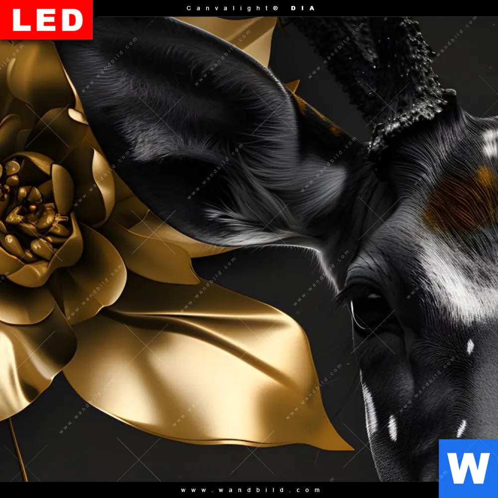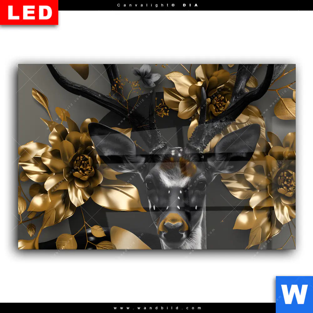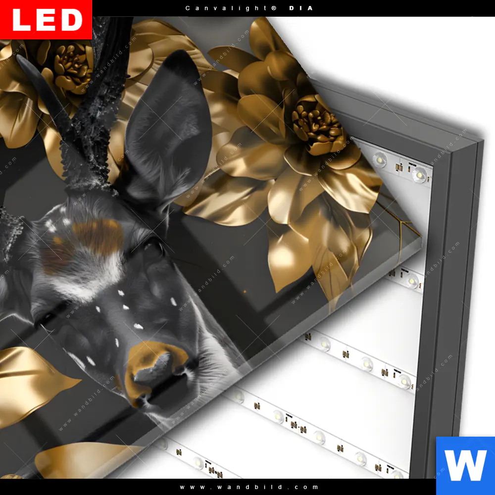 Wechselmotiv Acrylglas Canvalight® DIA | Junger Hirsch und Goldblumen | Querformat