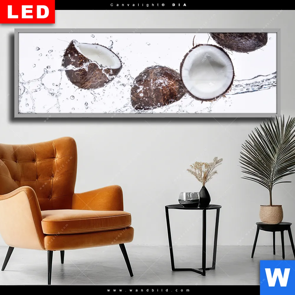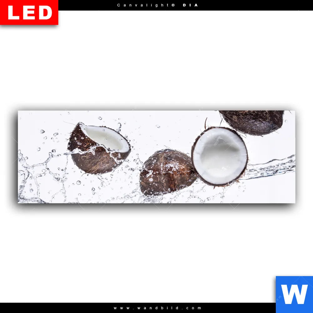 Wechselmotiv Acrylglas Canvalight® DIA | Kokosnüsse mit Wasserspritzer | Panorama