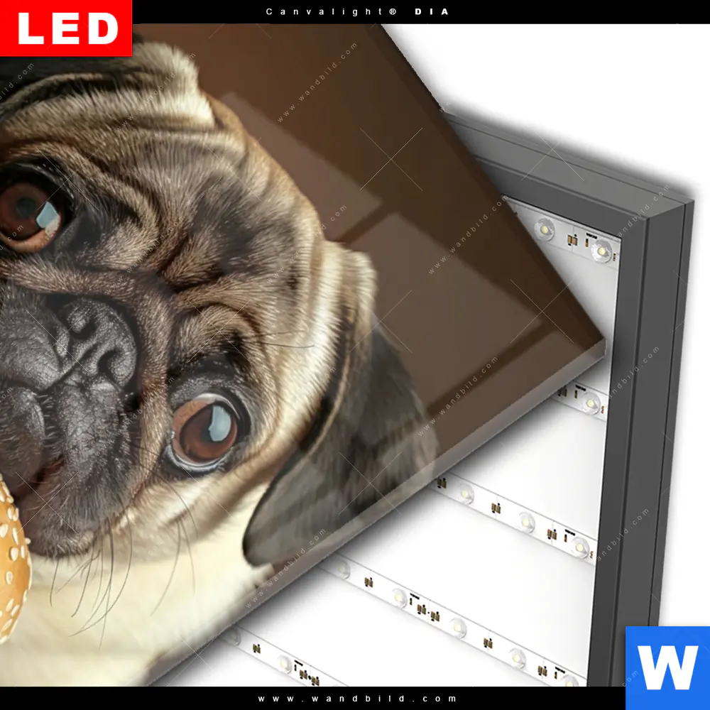 Wechselmotiv Acrylglas Canvalight® DIA | Mops mit Cheeseburger | Hochformat