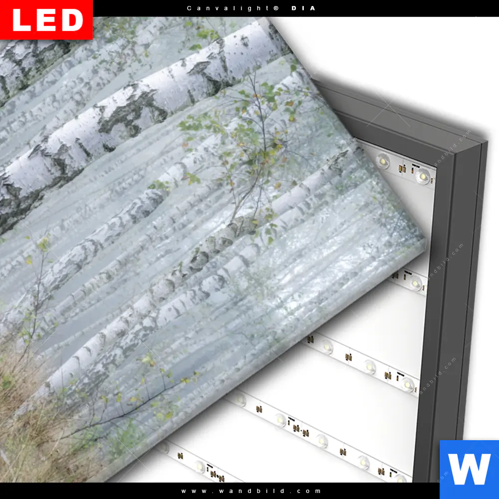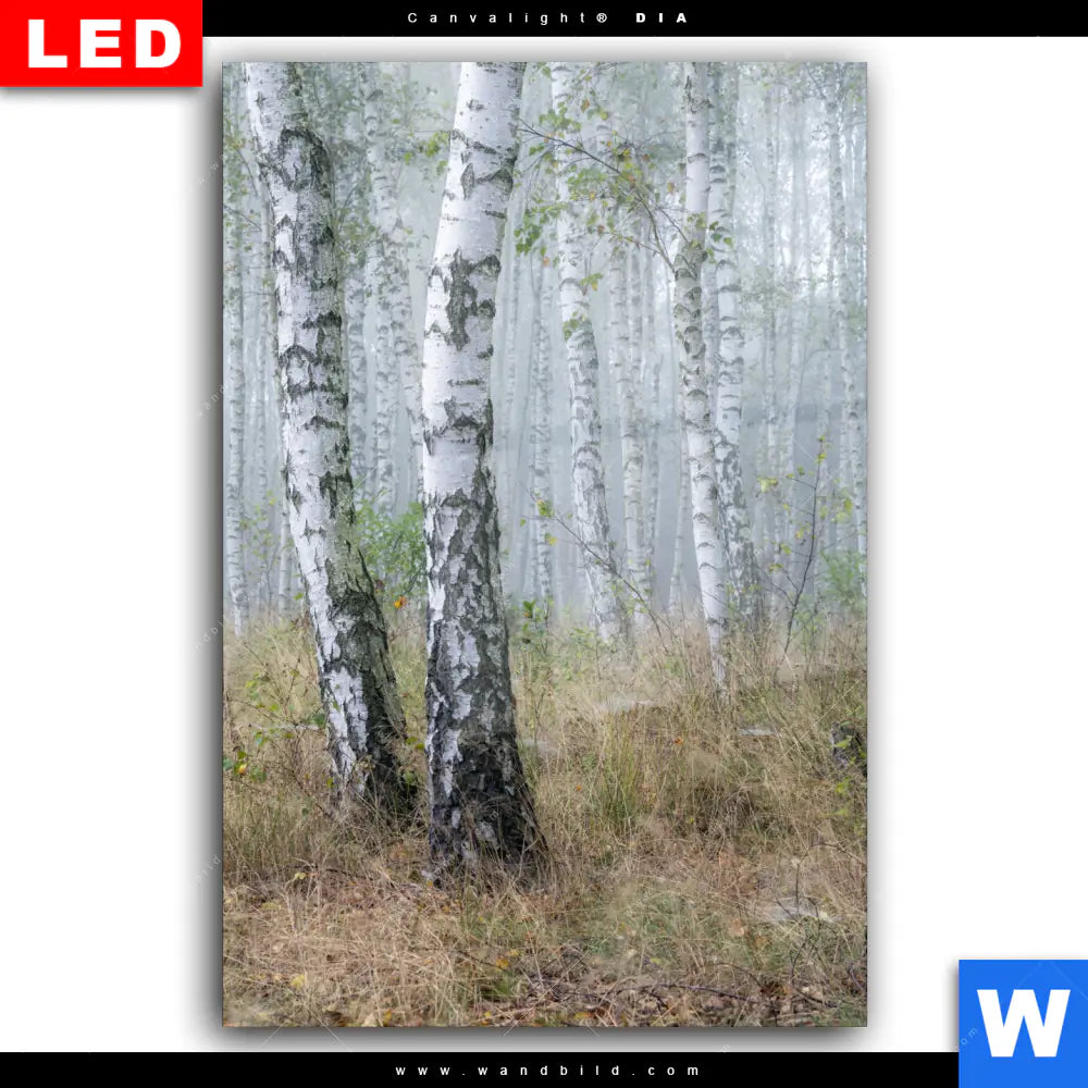Wechselmotiv Acrylglas Canvalight® DIA | Nebliger Morgen im Birkenwald | Hochformat