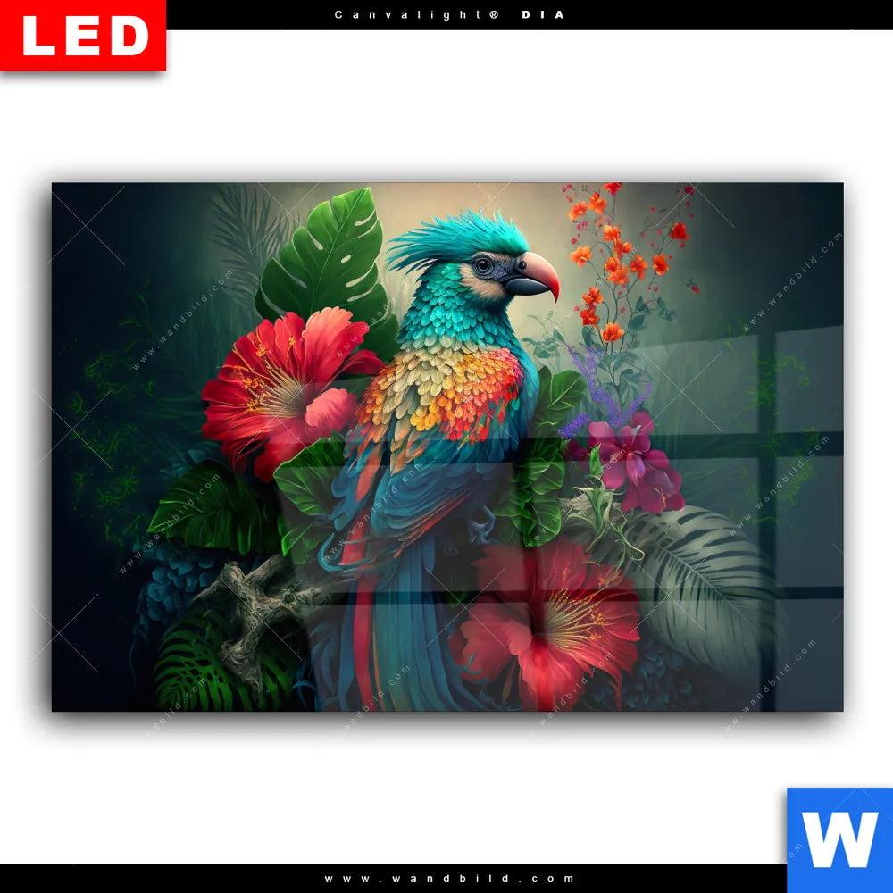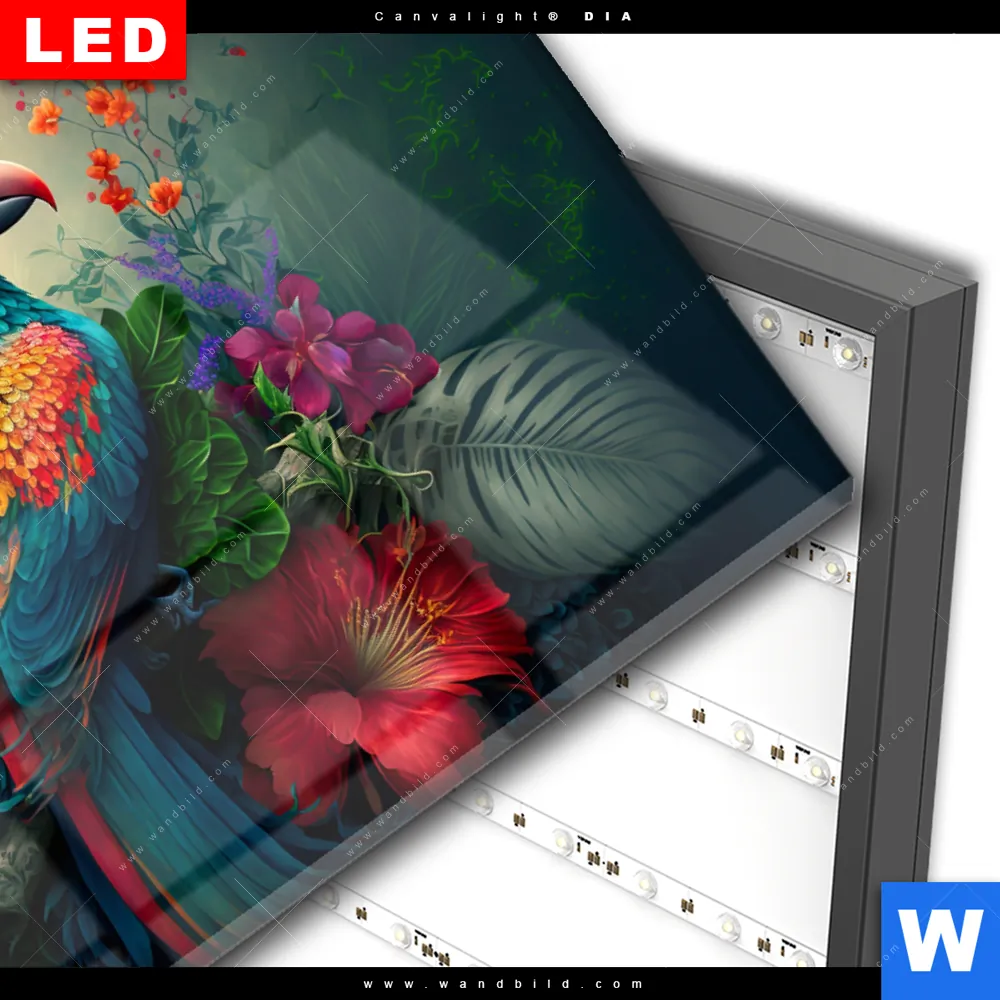 Wechselmotiv Acrylglas Canvalight® DIA | Papagei und tropischer Hibiskus | Querformat