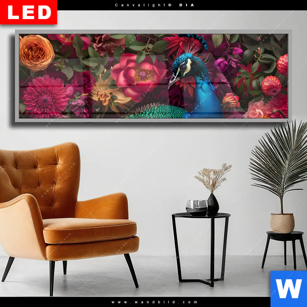 Wechselmotiv Acrylglas Canvalight® DIA | Prachtvoller Pfau und Blüten | Panorama