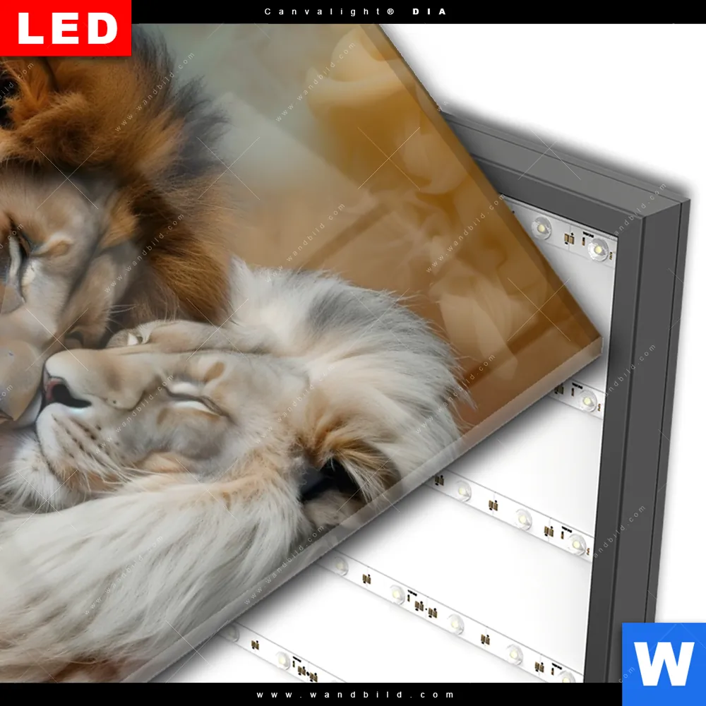 Wechselmotiv Acrylglas Canvalight® DIA | Sanfte Löwenmomente in buntem Nebel | Hochformat