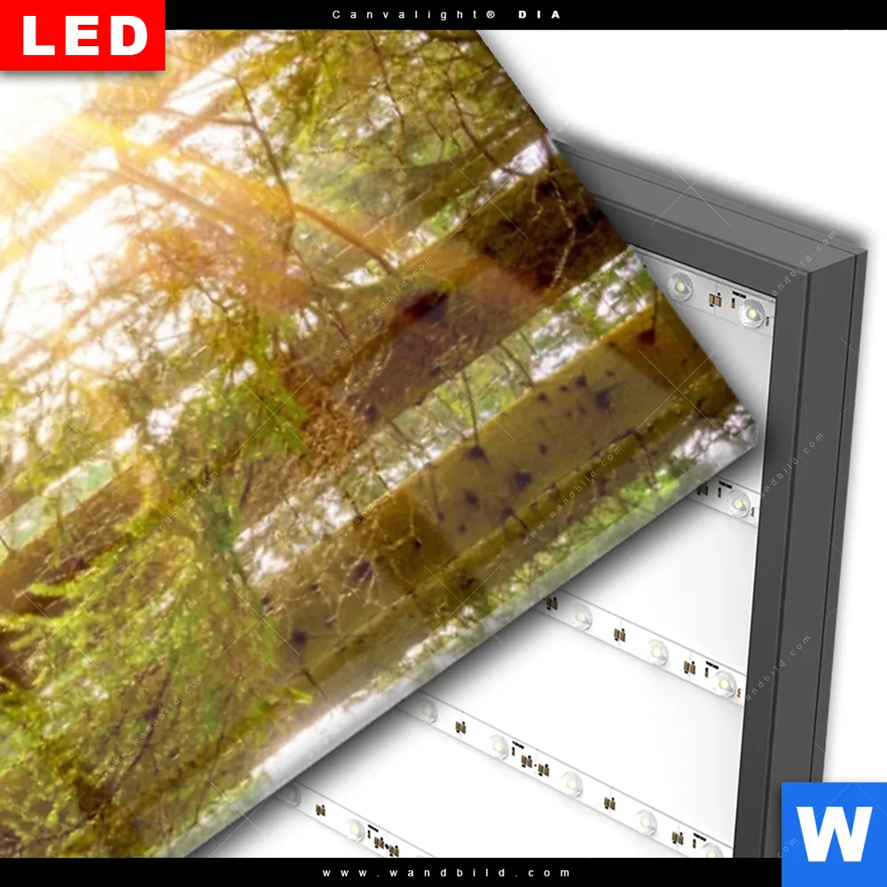 Wechselmotiv Acrylglas Canvalight® DIA | Sonne im grünen Wald | Schmal