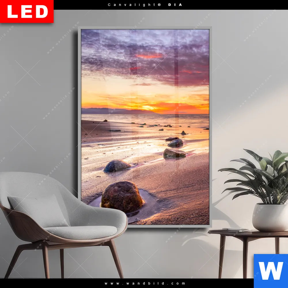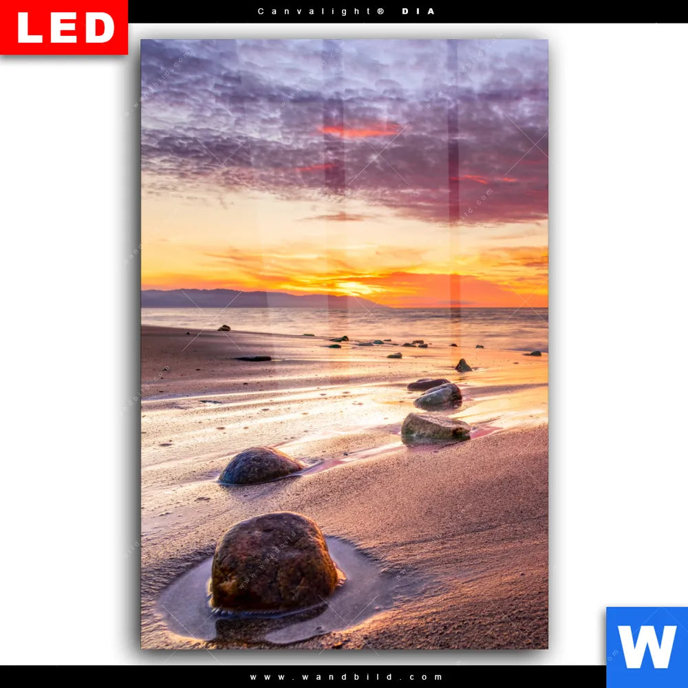 Wechselmotiv Acrylglas Canvalight® DIA | Sonnenuntergang am Strand mit Felsen | Hochformat