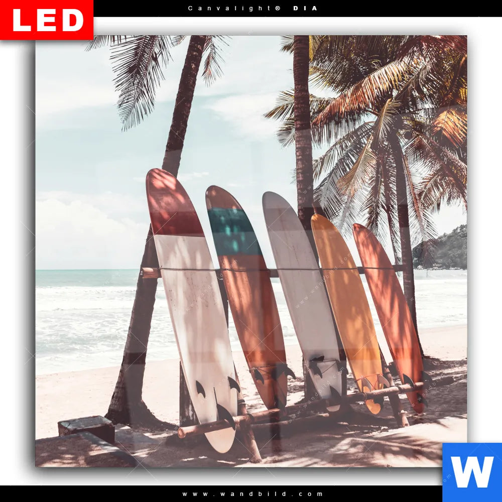 Wechselmotiv Acrylglas Canvalight® DIA | Surfbretter und Palmen | Quadrat