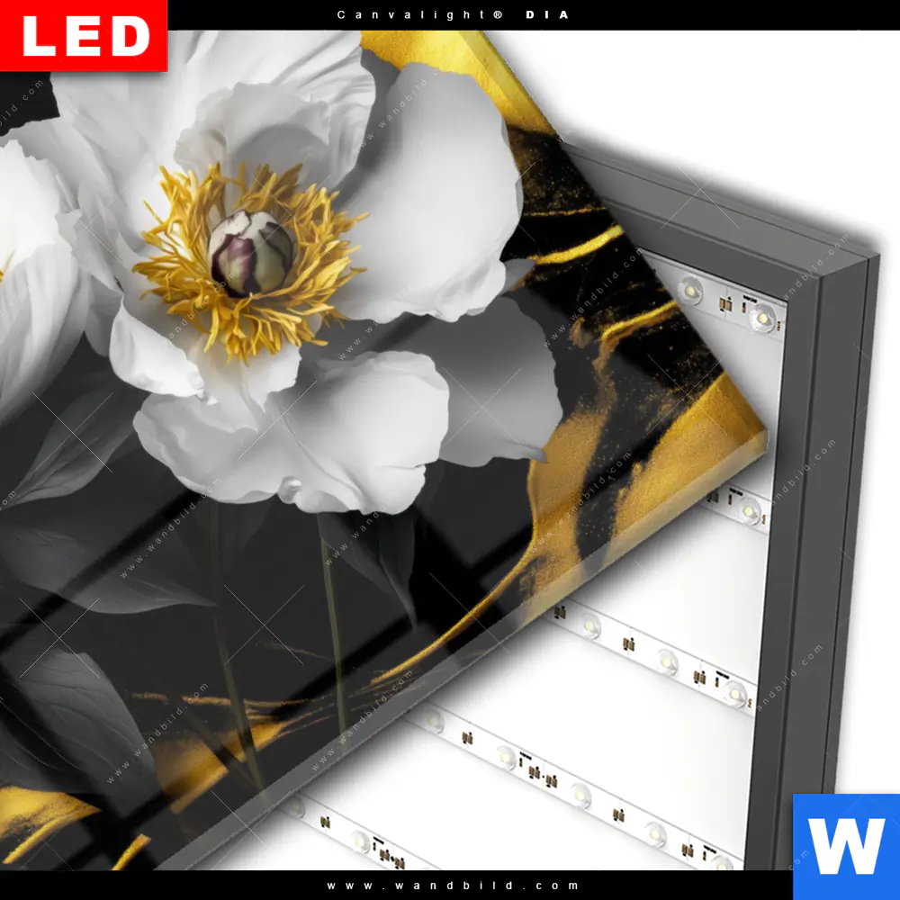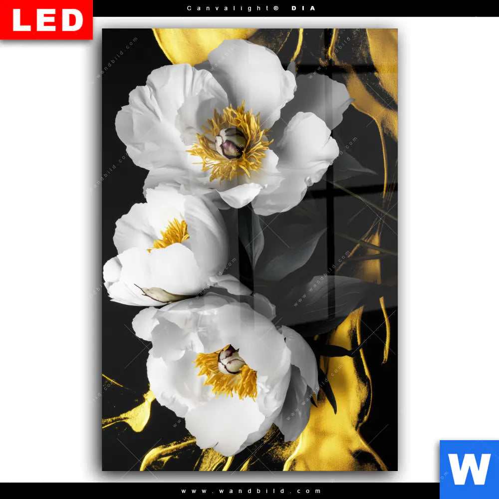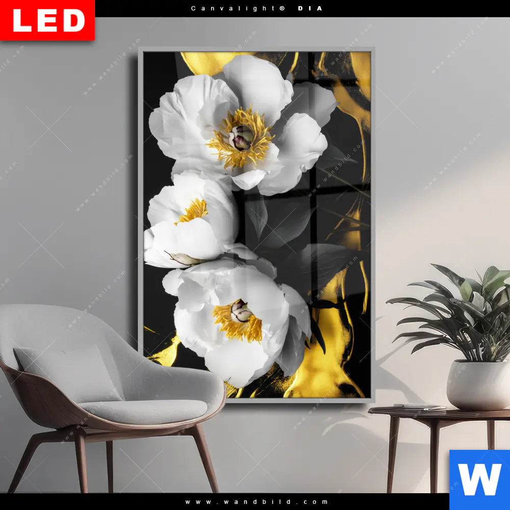 Wechselmotiv Acrylglas Canvalight® DIA | Weiße Blumen mit Gold | Hochformat