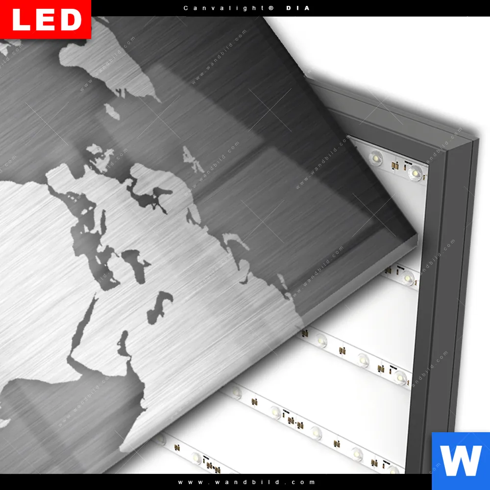 Wechselmotiv Acrylglas Canvalight® DIA | Weltkarte Edelstahloptik | Hochformat