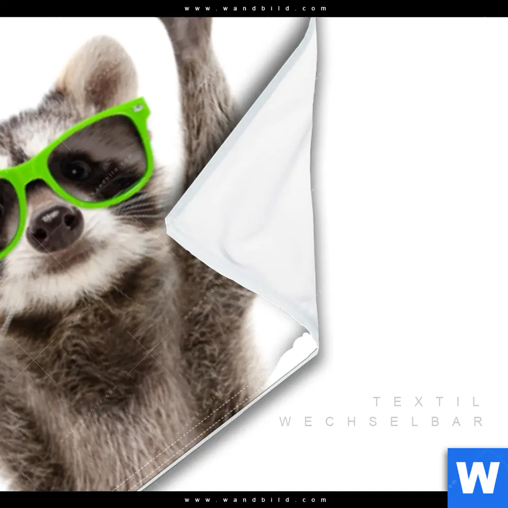 Wechselmotiv Textil | Lustige Waschbären mit Hund | Panorama