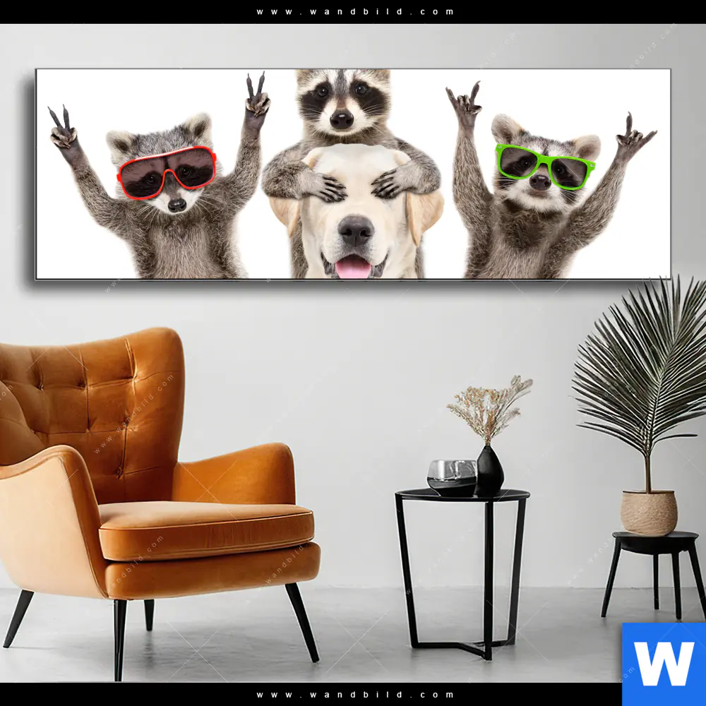 Wechselmotiv | Lustige Waschbären mit Hund | Panorama