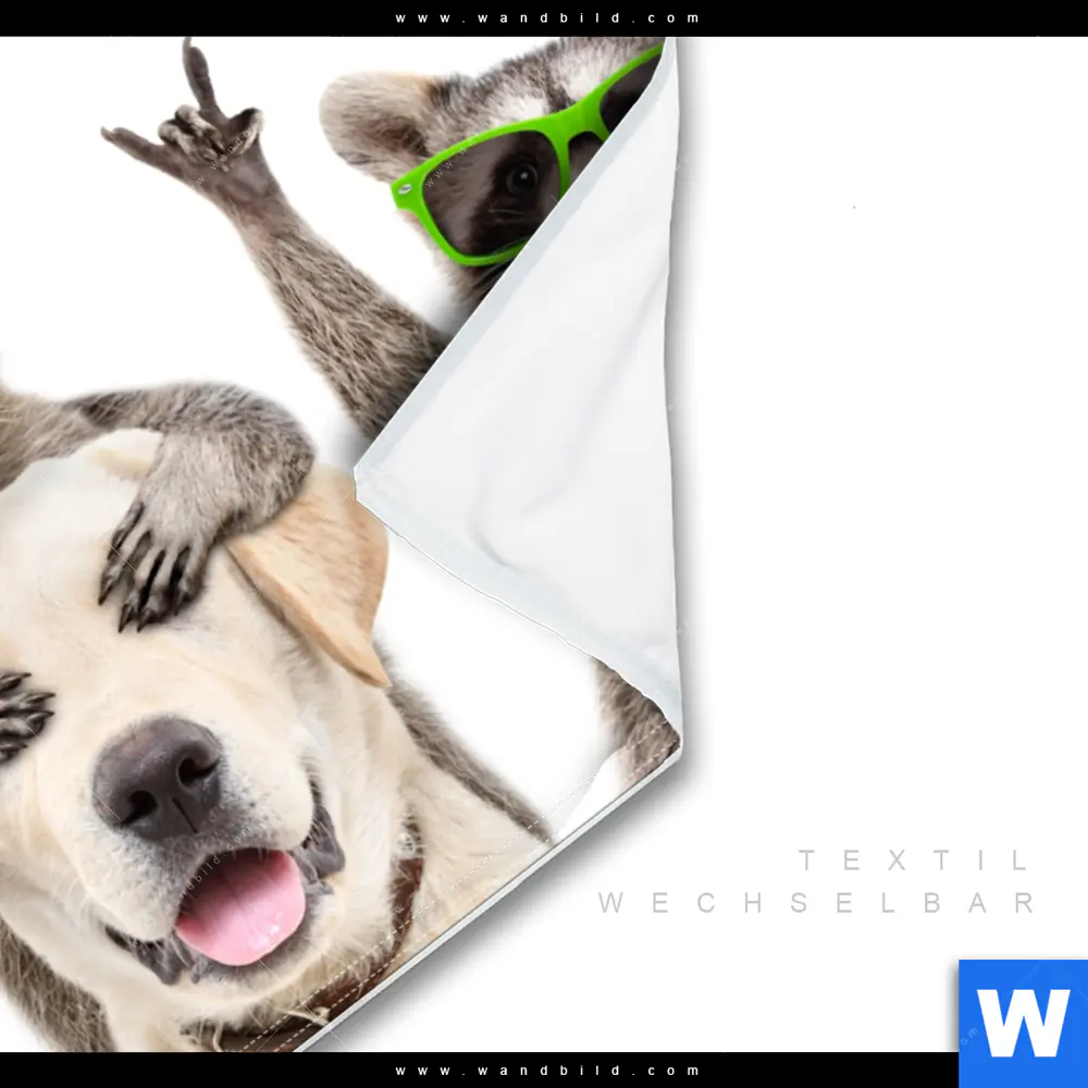 Wechselmotiv Textil | Lustige Waschbären mit Hund | Querformat