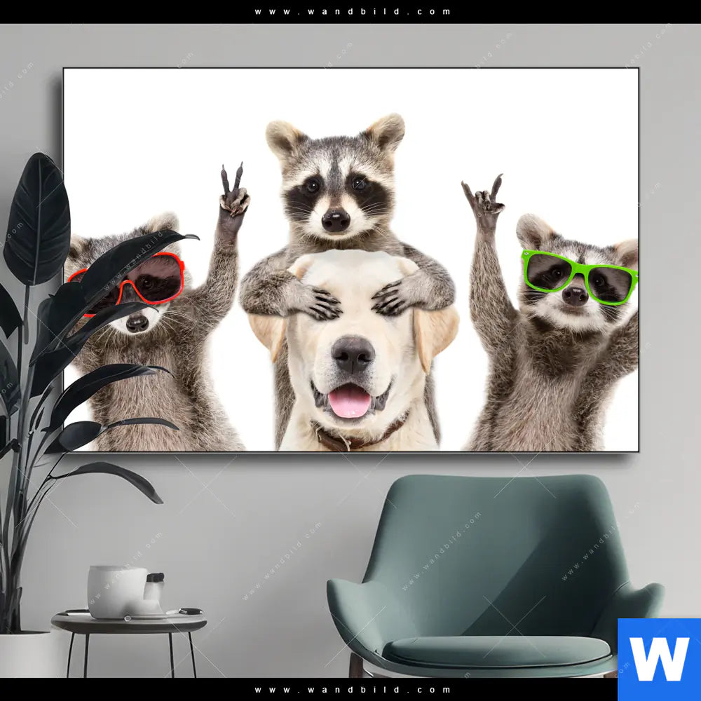 Wechselmotiv | Lustige Waschbären mit Hund | Querformat