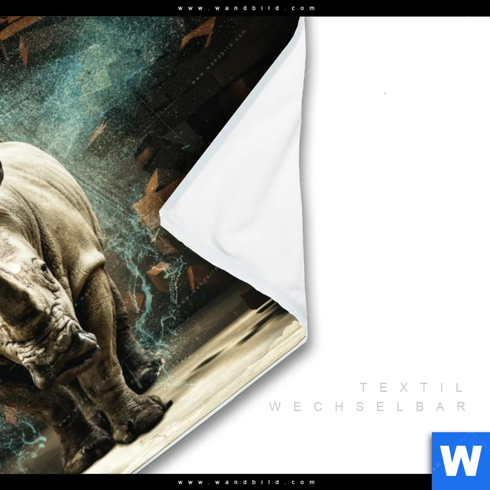 Wechselmotiv Textil | Nashorn zerstört Wand | Querformat