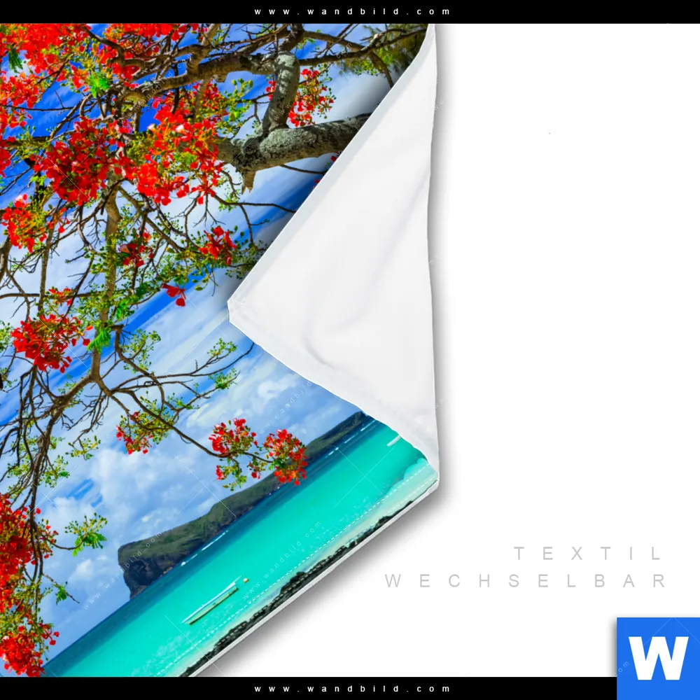 Wechselmotiv Textil | Rote Blüten und Türkisfarbenes Meer | Quadrat