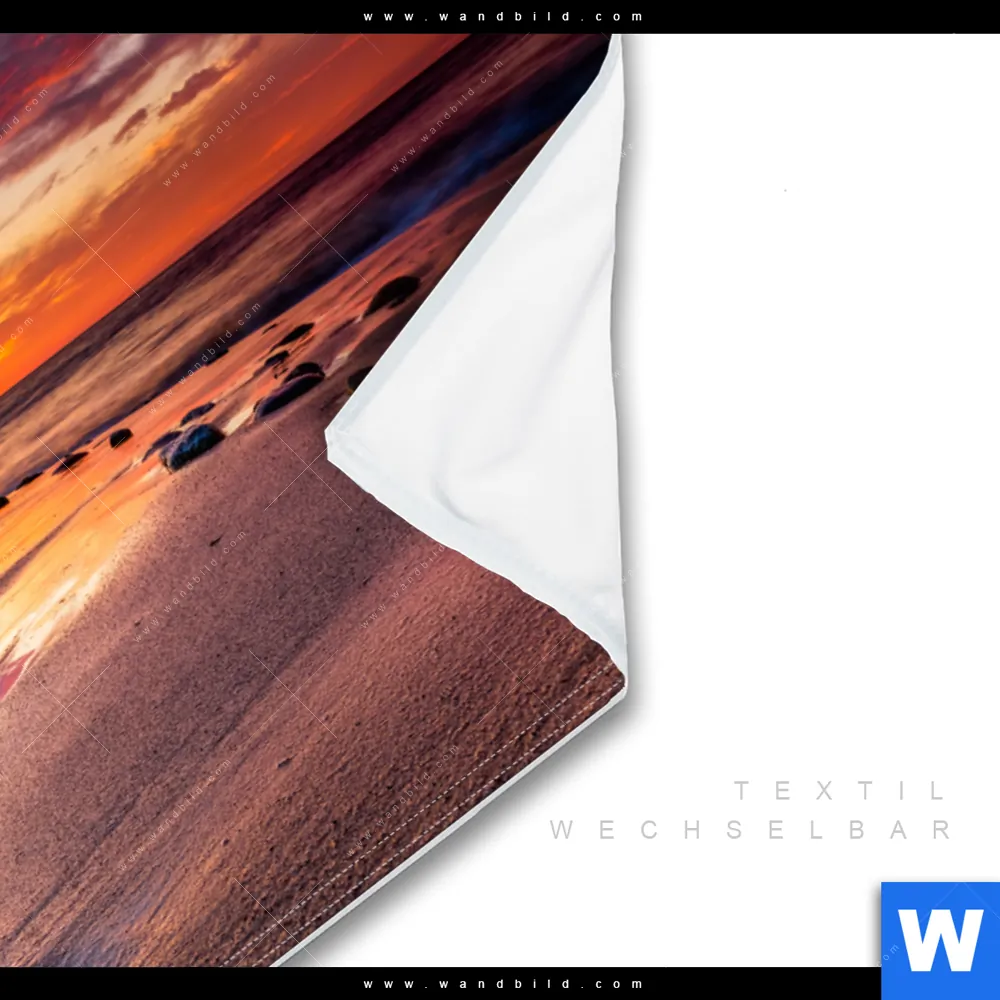 Wechselmotiv Textil | Sonnenuntergang am Strand mit Felsen | Querformat