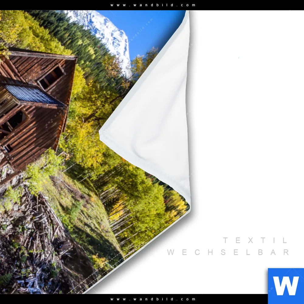 Wechselmotiv Textil | Waldhütte am Fluss | Hochformat