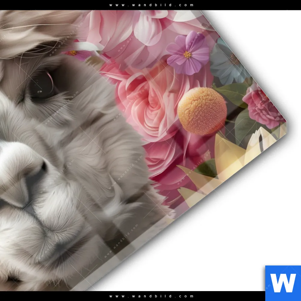 Acrylglasbild | Alpaka mit Blumen | Querformat