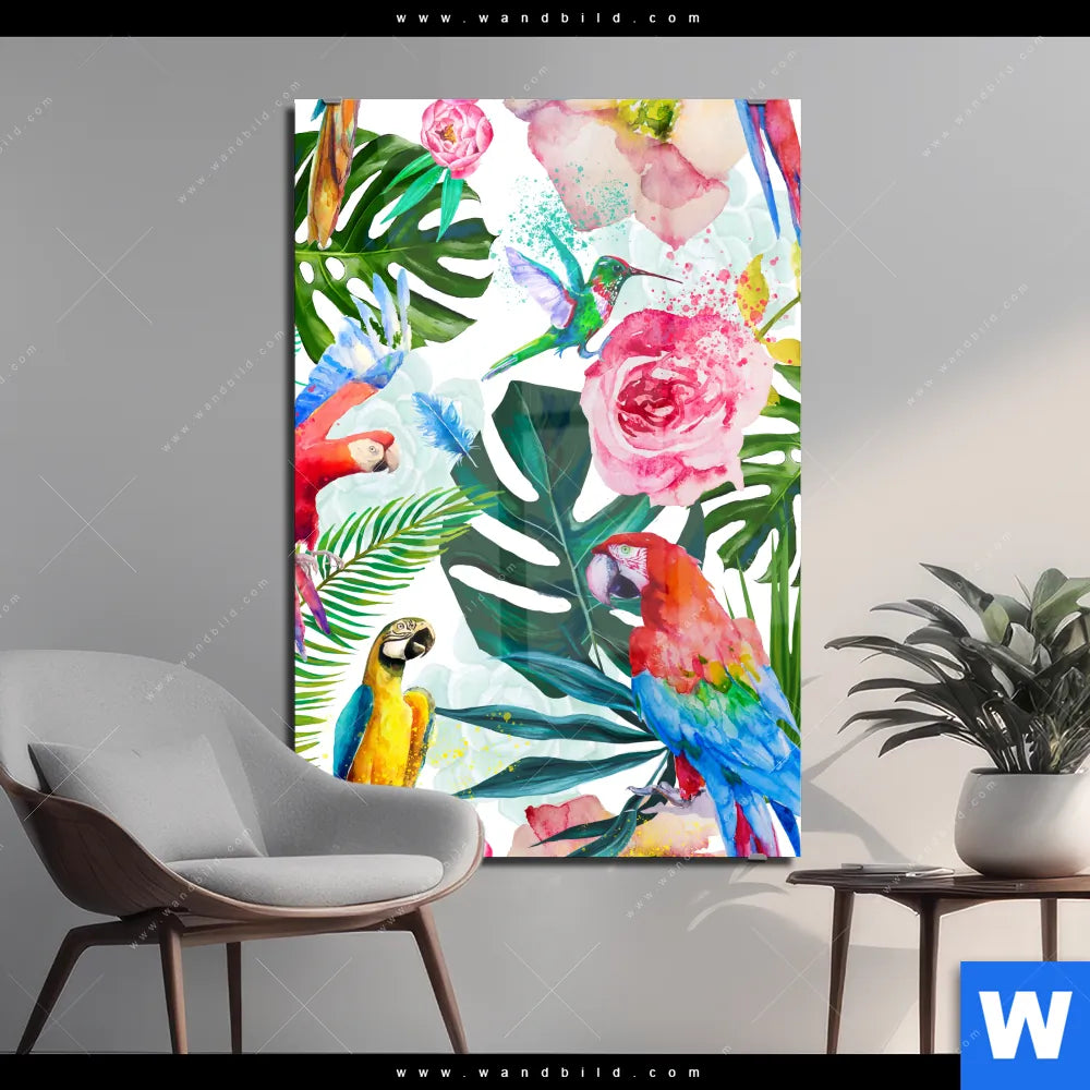Acrylglasbild | Blumen & Papageien Aquarell | Hochformat