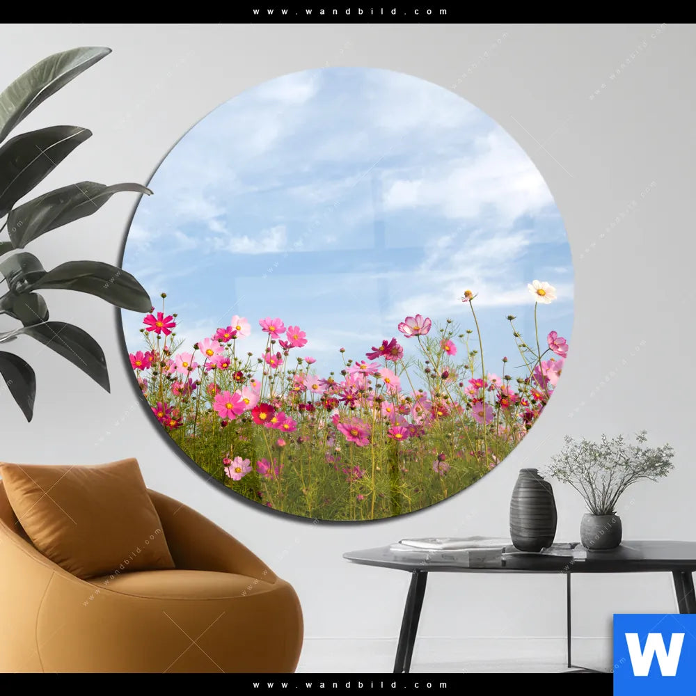 Acrylglasbild | Blumenwiese bei strahlend blauem Himmel | Rund