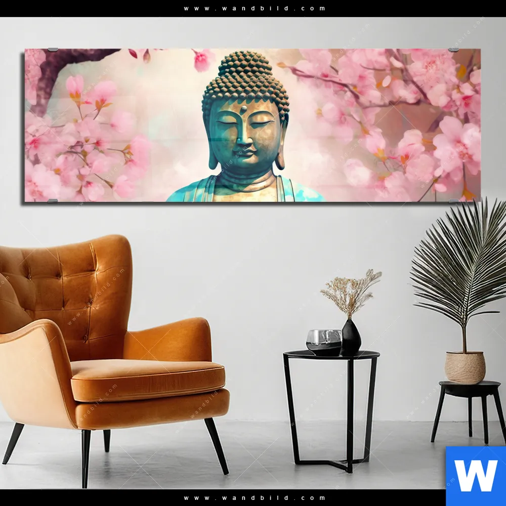 Acrylglasbild | Buddha Statue mit Kirschblüten | Panorama