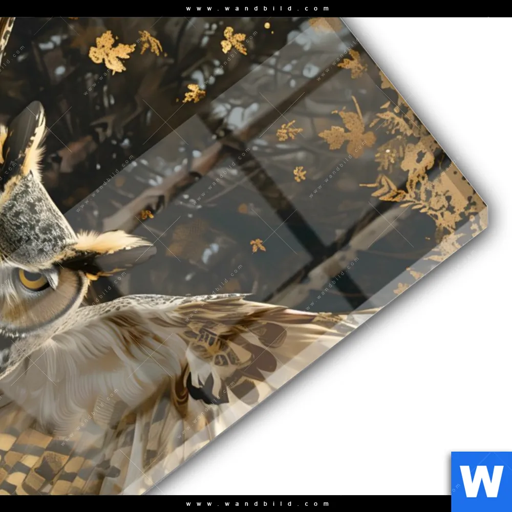 Acrylglasbild | Eule inmitten goldener Blätter | Hochformat
